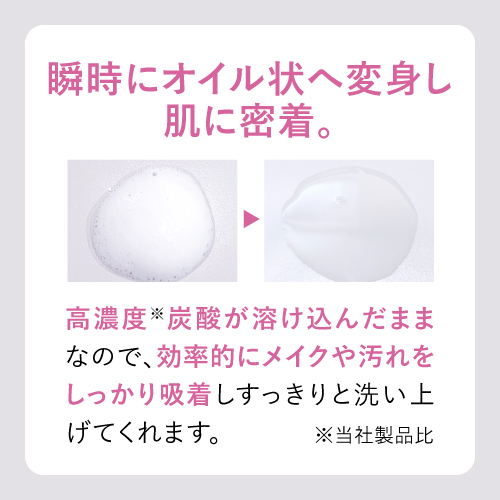 高濃度(※1)10,000ppmの炭酸がメイク汚れをやさしく"浮かせて"するんと落とす、炭酸クレンジング。擦らずなじませるだけなので、肌あたりがよく負担をかけません。瞬時にオイル状にとろけて肌に密着。高濃度(※1)炭酸が溶け込んだままなので、効率的にメイクや汚れを落とします。