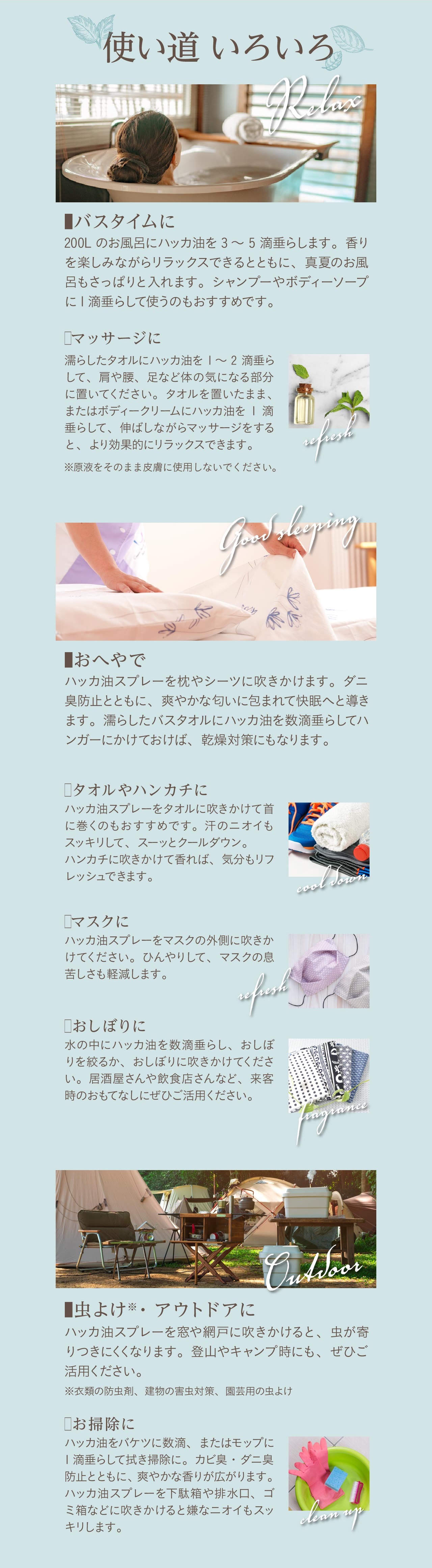 虫よけ、熱中症対策、デオドランド、クールダウン、お掃除などに。