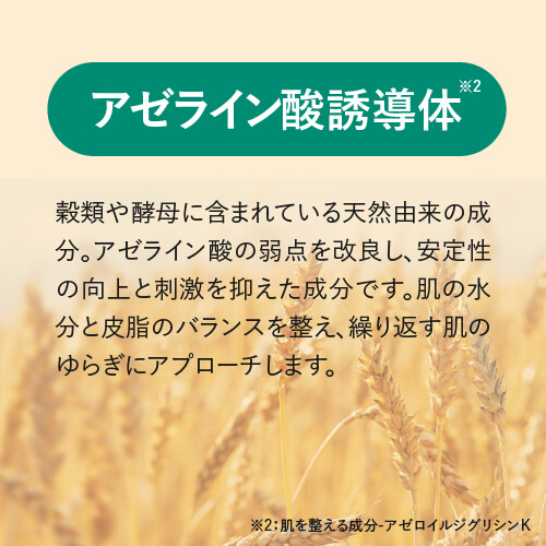 肌のゴワつき・ザラつきや凸凹が気になるなど、ゆらぎやすくトラブルを繰り返す大人肌悩みの、「トラブルを生み出す”乾燥”」と「過剰に分泌される”皮脂”」に着目しました。保湿性が高いグリシルグリシン(※1)が乾燥を防ぎ、アゼライン酸誘導体(※2)が肌の水分と油分のバランスを整え、ハリのあるゆらぎにくい肌へ導きます。