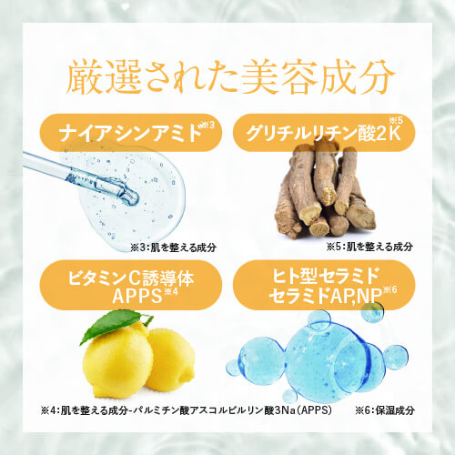 ナイアシンアミド(※2)、ビタミンC誘導体(APPS)(※2)、グリチルリチン酸2K(※2)、2種のヒト型セラミド(※3)、ヒアルロン酸Na(※4)、14種のアミノ酸(※5)など、肌に嬉しい美容成分をたっぷり配合しました。