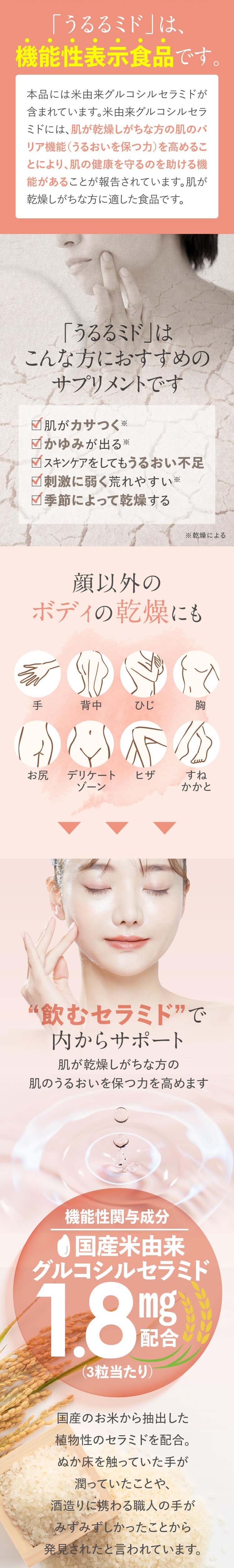 「うるるミド」は肌の乾燥が気になる方におすすめの食品です。主成分として、米由来のセラミドを3粒あたり1.8mg配合いたしました。日本人の主食である米から抽出された植物由来のセラミドが、肌のバリア機能(うるおいを保つ力)を高め、乾燥しがちな肌のうるおいを守るサポートをします。