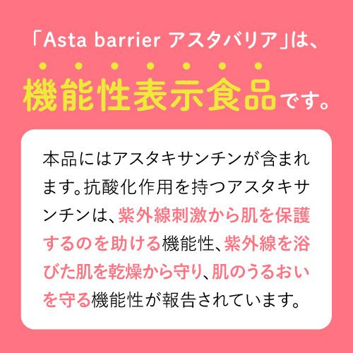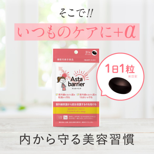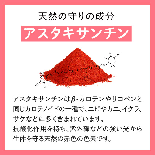 本品にはアスタキサンチンが含まれます。抗酸化作用を持つアスタキサンチンは、紫外線刺激から肌を保護するのを助ける機能性、紫外線を浴びた肌を乾燥から守り、肌のうるおいを守る機能性が報告されています。
