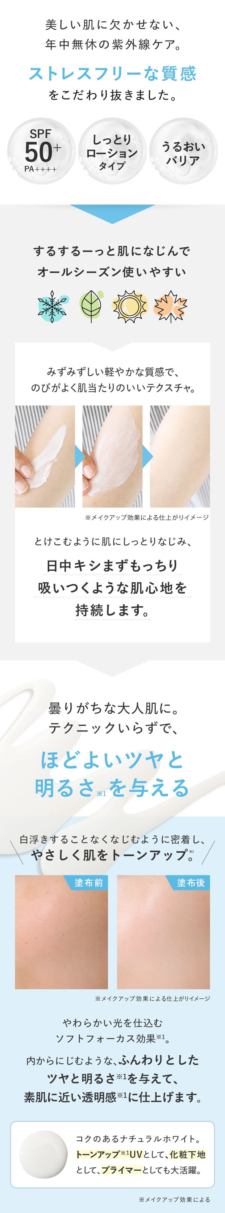 曇りがちな大人肌にも白浮きすることなく密着し、やさしく肌をトーンアップ(※1)。内からふんわりとしたツヤと明るさ(※1)を与え、素肌に近い透明感(※1)に仕上げます。