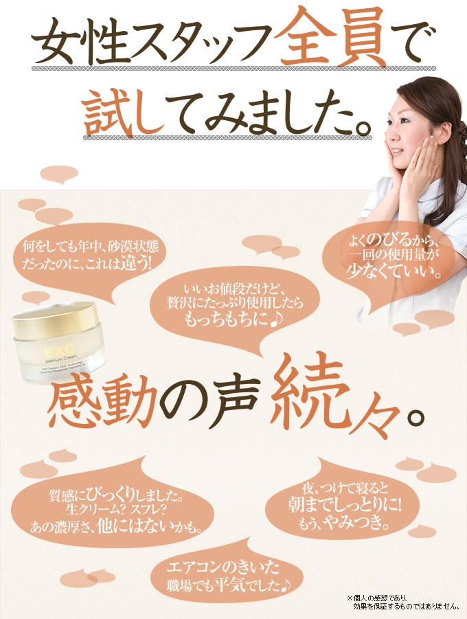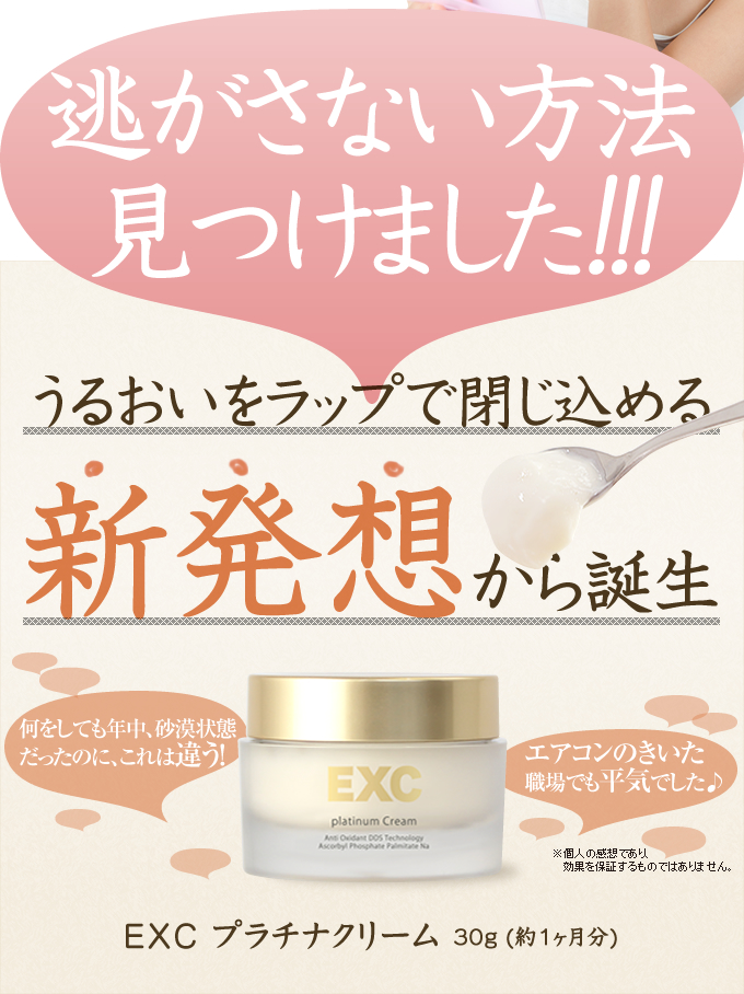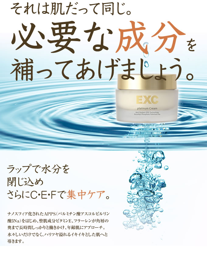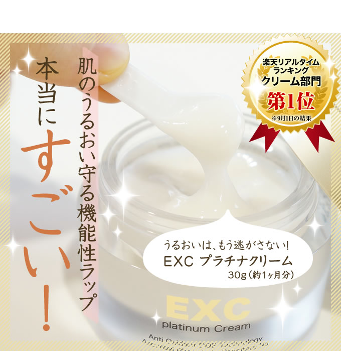 リッチなラップ効果でツヤツヤ潤い肌EXC プラチナクリームナノサイズのカプセルに美容成分を閉じ込めるなんスフィリアシステム採用5種類のペプチドは弾力とハリ、4種のビタミン誘導体 APPS EPC VCエチル TPNaはツヤと透明感へと導きます肌に伸ばすと体温となじむのか透明になって、どんどん伸びる… 2014/11/14