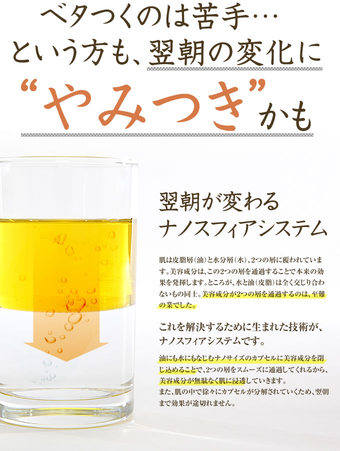皮脂にも水にもなじむナノサイズのカプセルに、美容成分を閉じ込める ナノスフィアシステムを採用。肌の皮脂層と水分層をスムーズに通過し、 無駄なく肌に届きます。また、カプセルが肌の中で徐々に分解されていくため、作用が長時間持続します。