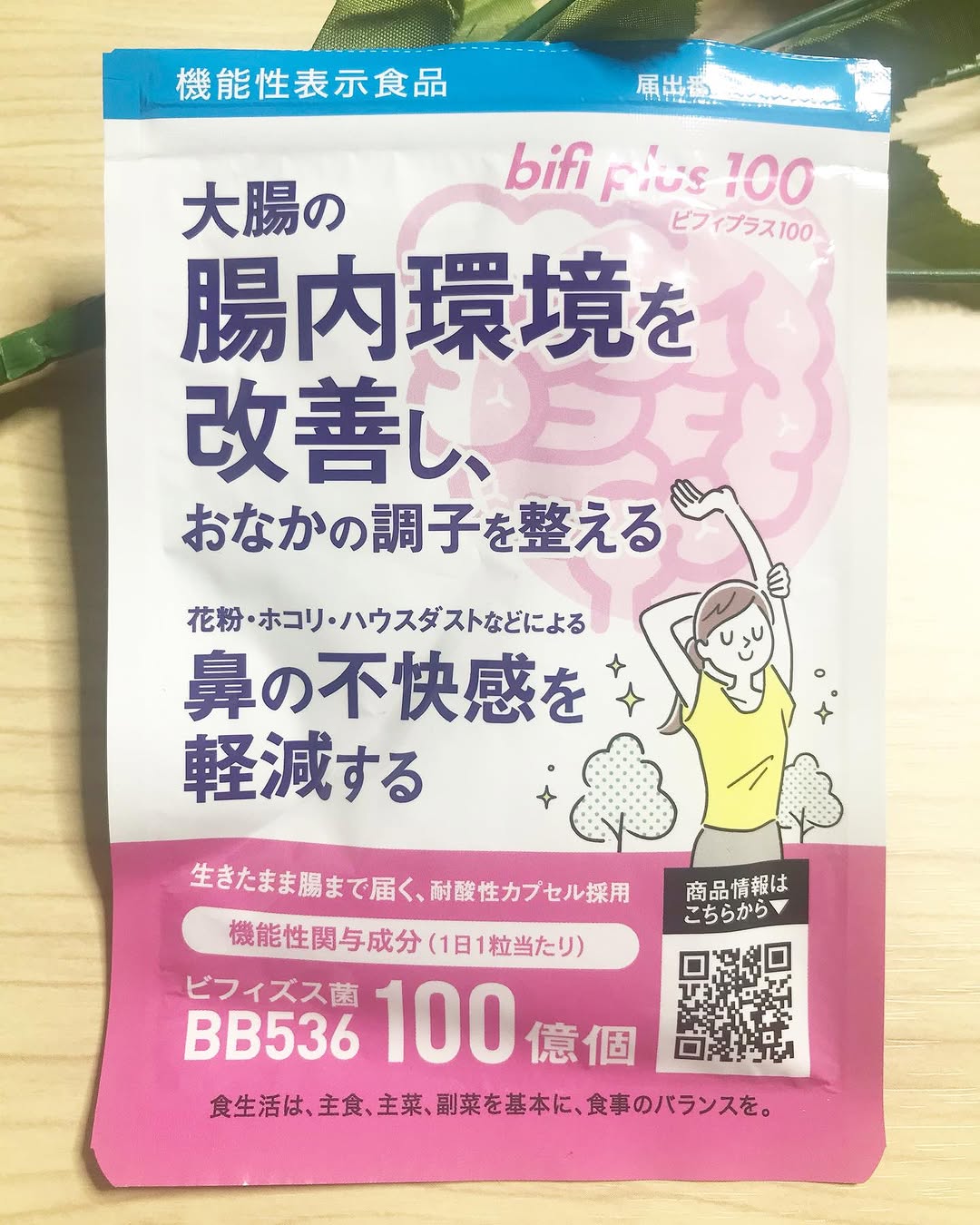 腸内環境を整えたい方、花粉・ホコリ・ハウスダストなどによる鼻の不快感(※1)でお悩みの方に。1日目安量1粒で、『ビフィズス菌BB536』100億個を簡単に補給できる医師監修の機能性表示食品です。ビフィズス菌BB536を生きたまま腸まで届ける『耐酸性カプセル』を採用しています。 ビフィズス菌BB536は他のビフィズス菌と比べて酸や酸素につよい性質があります。乳児から大人まで腸内に多く棲んでおり、ヒトに棲む・ヒトに合ったビフィズス菌と考えられています。 さらに、大腸まで到達し腸内でビフィズス菌のエサとなる、サポート成分ラクチュロース(※2)をプラス配合。 ◇保存料・着色料・増粘剤・酸化防止剤・人工甘味料・安定剤 不使用 (※1)花粉・ホコリ・ハウスダストなどによる鼻の不快感が気になる健常者およびアレルギー治療薬を常用していない軽症者 (※2)機能性関与成分ではございません。また、機能性関与成分との相乗効果はございません。