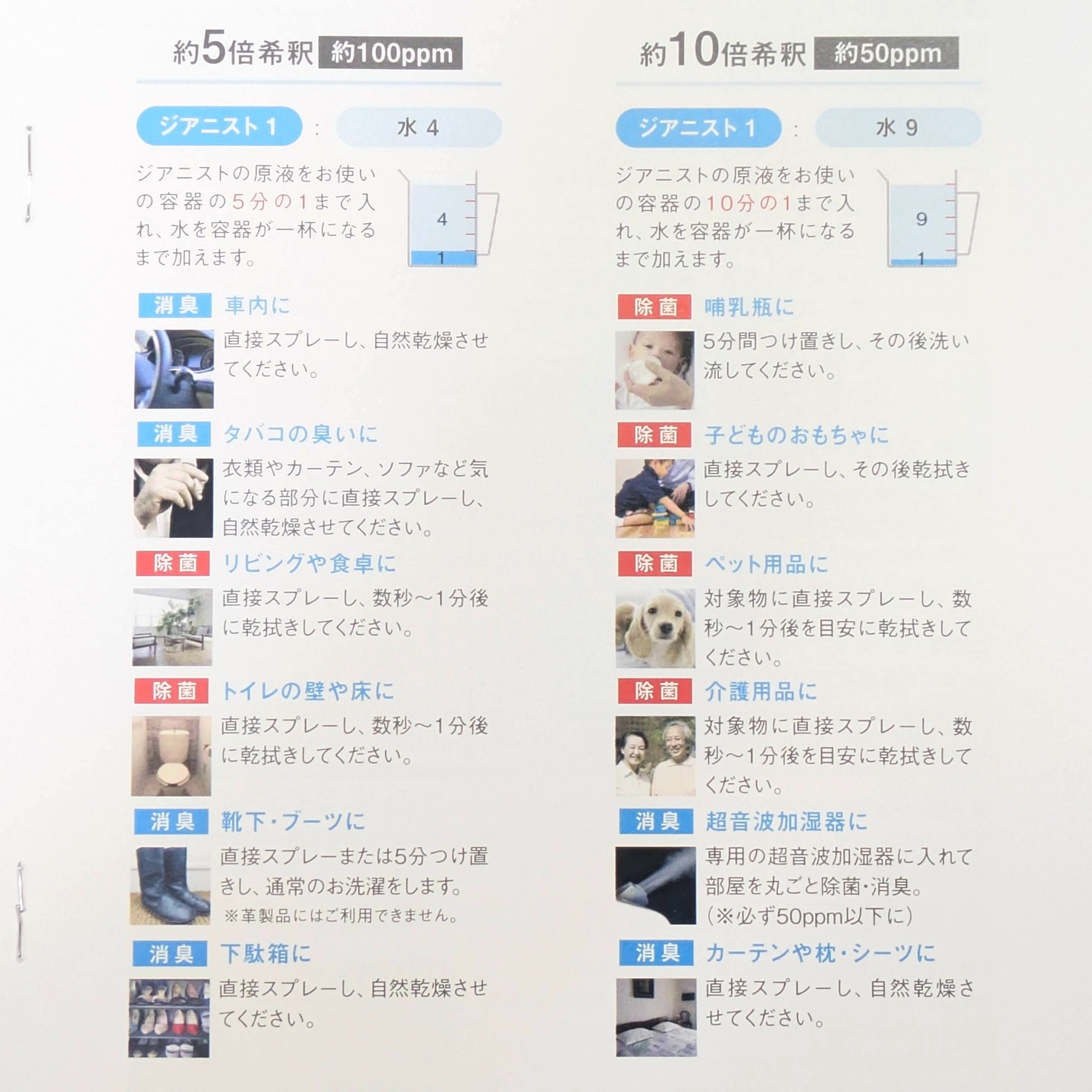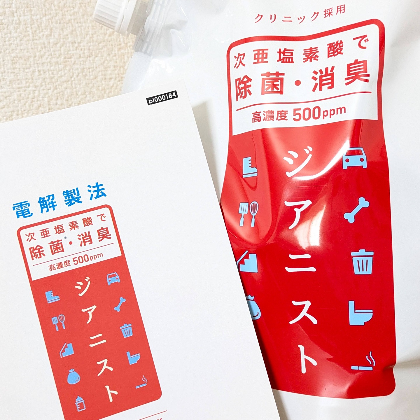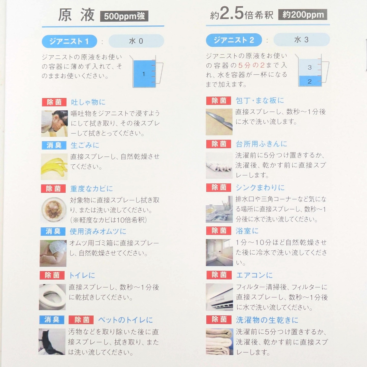 「ジアニスト」は浄水と塩を無隔膜電解槽で電気分解し製造した電解水を微細バブル発生ノズルに導通させ二酸化炭素を含有させたた超微細気泡含有微酸性次亜塩素酸水溶液「電解製法(6122139号等)」です。 出荷時の有効塩素濃度は500ppm強と高濃度の為、用途に応じ水道水で希釈し微酸性 次亜塩素酸水(pH5.8~6.5前後)としてお使い頂けます。吐しゃ物・ペットの汚物・カビ等の除菌・消臭には原液でもOK。10倍(約50ppm)に希釈すれば部屋中の幅広い拭取り除菌・消臭水(次亜塩素酸水)としてお使い頂けます。 専用の超音波噴霧器に10倍以上に希釈したジアニストを入れて使用すると空間除菌※も可能です。ジアニストはウイルスや菌(アルコール耐性のあるウイルス等)にも強く機能しますが、有機物に触れると水と約0.02%の塩に戻るため、清潔に使用したいものに幅広くお使いいただけます。 その他、多湿時のペットの獣臭や尿臭、トイレのアンモニア臭、タバコや汗の臭い、靴やスリッパの嫌な臭い、生ごみや洗濯物の生乾きなど、細菌の繁殖により発生する嫌な臭いにも効果があります。