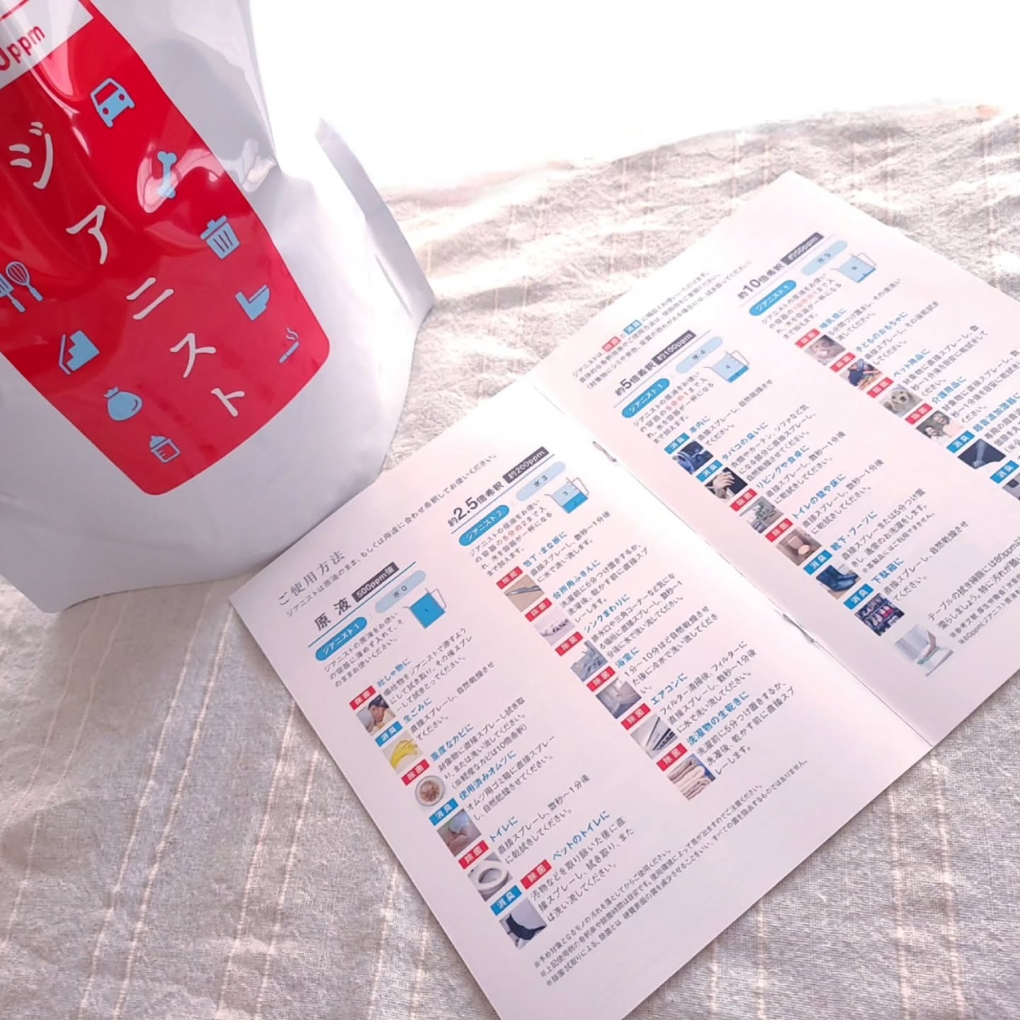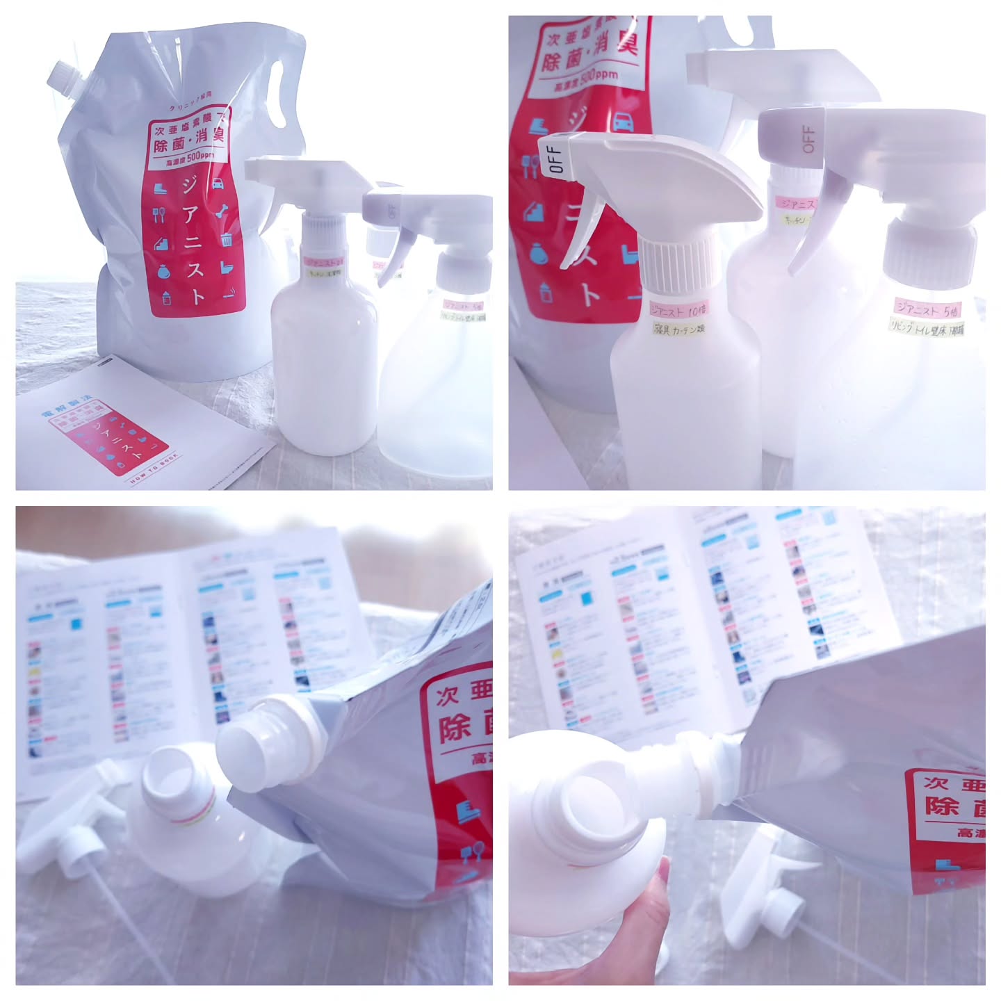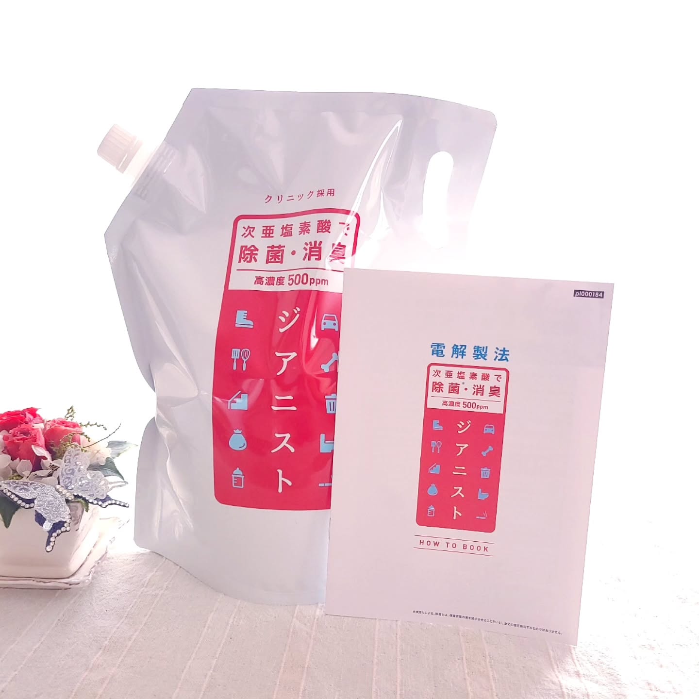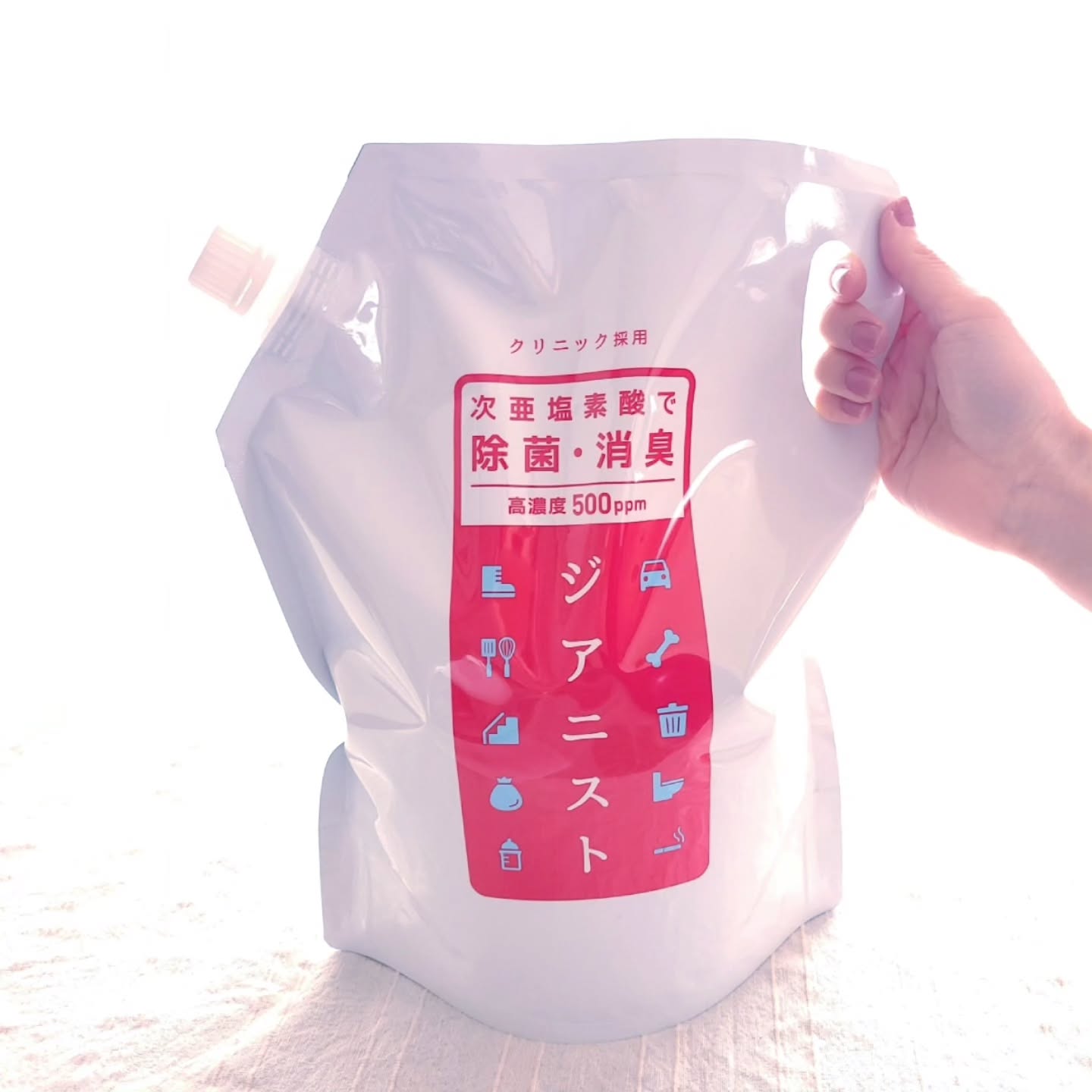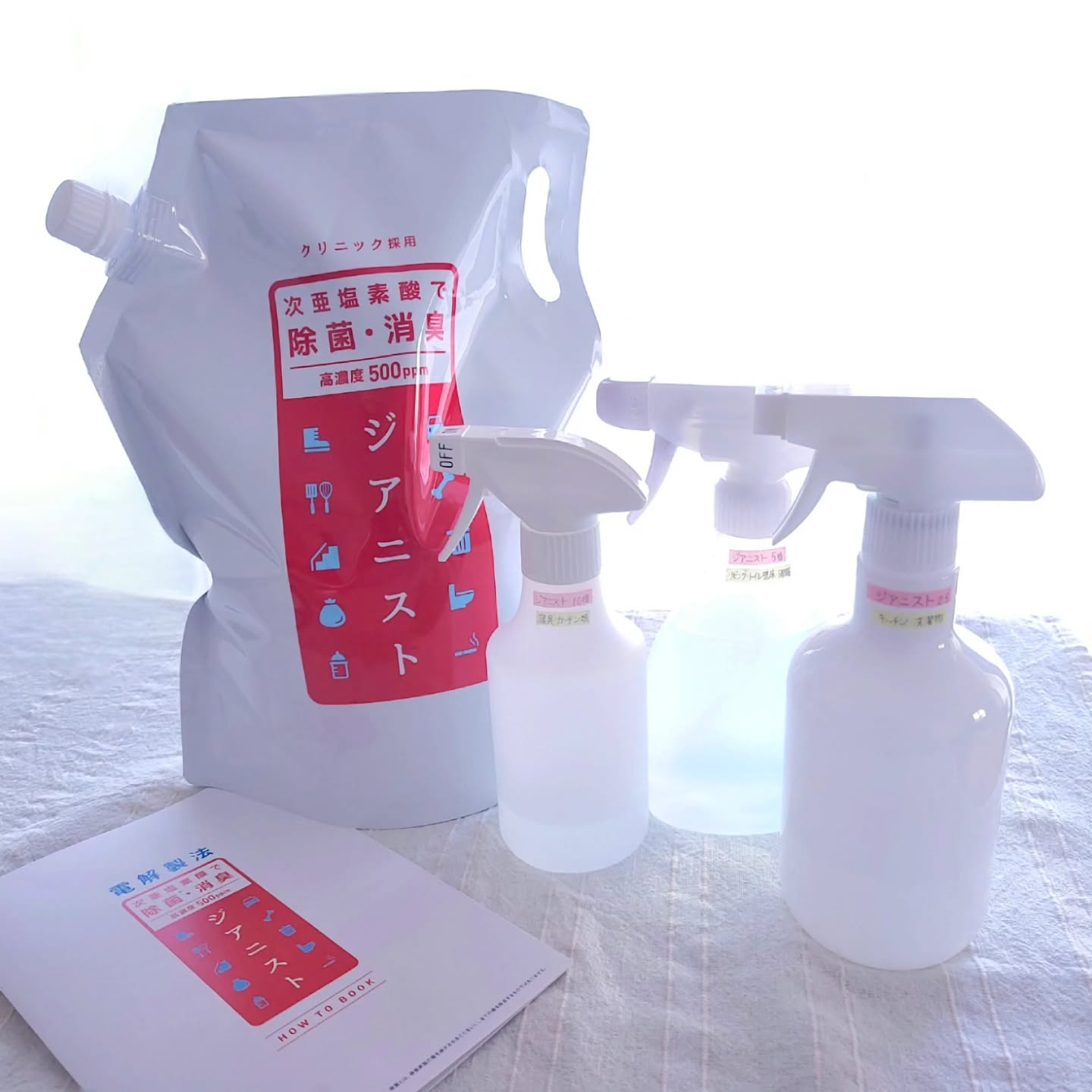 「ジアニスト」は浄水と塩を無隔膜電解槽で電気分解し製造した電解水を微細バブル発生ノズルに導通させ二酸化炭素を含有させたた超微細気泡含有微酸性次亜塩素酸水溶液「電解製法(6122139号等)」です。 出荷時の有効塩素濃度は500ppm強と高濃度の為、用途に応じ水道水で希釈し微酸性 次亜塩素酸水(pH5.8~6.5前後)としてお使い頂けます。吐しゃ物・ペットの汚物・カビ等の除菌・消臭には原液でもOK。10倍(約50ppm)に希釈すれば部屋中の幅広い拭取り除菌・消臭水(次亜塩素酸水)としてお使い頂けます。 専用の超音波噴霧器に10倍以上に希釈したジアニストを入れて使用すると空間除菌※も可能です。ジアニストはウイルスや菌(アルコール耐性のあるウイルス等)にも強く機能しますが、有機物に触れると水と約0.02%の塩に戻るため、清潔に使用したいものに幅広くお使いいただけます。 その他、多湿時のペットの獣臭や尿臭、トイレのアンモニア臭、タバコや汗の臭い、靴やスリッパの嫌な臭い、生ごみや洗濯物の生乾きなど、細菌の繁殖により発生する嫌な臭いにも効果があります。
