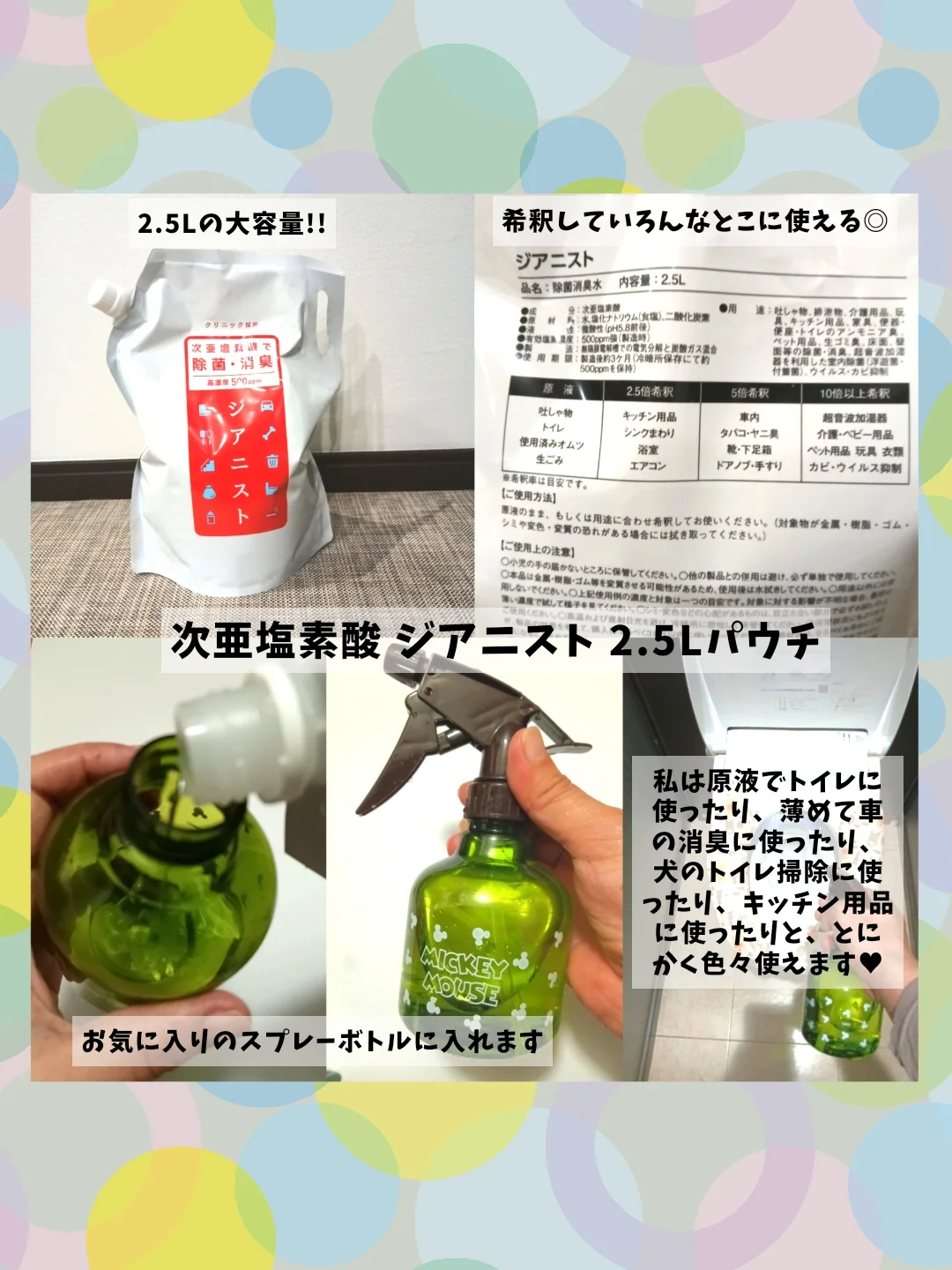 エクセレントメディカル様より商品提供していただきました🙇‍♀ --------------------------- 次亜塩素酸 ジアニスト 2.5Lパウチ --------------------------- こちらは水、食塩、二酸化炭素からできた除菌水だそうです🫧 (次亜塩素酸とは、アルコールやエタノールを含まない、無色・透明・無刺激性、肌と同じ微酸性の除菌※・消臭剤) 次亜塩素酸水溶液は有機物に触れるとウイルスや菌を分解し、最後は水に戻るとのことで、犬を飼ってる私はとってもありがたい😭💕 早速、使ってみました↓ こちらは大容量パウチタイプなので、お気に入りのスプレーボトルに入れました! スプレーしたときはなんかわからないですが香りがしますが、時間がたつと香りがしなくなります🤔 私は原液でトイレに使ったり、薄めて車の消臭に使ったり、犬のトイレ掃除に使ったり、キッチン用品に使ったりと、とにかく色々使えます😍 ※拭き取りによる除菌 気になる方は是非🕵️‍♀️💕 最後までお読みいただき ありがとうございました🙇‍♀ ♡・保存・フォロー 嬉しいです🐕💕 #PR #エクセレントメディカル #ジアニスト #次亜塩素酸水 #次亜塩素酸 #ペット消臭 #ペット消臭剤 #ペットアイテム #除菌グッズ #除菌アイテム #ウイルス対策 #monipla #pycno_fan