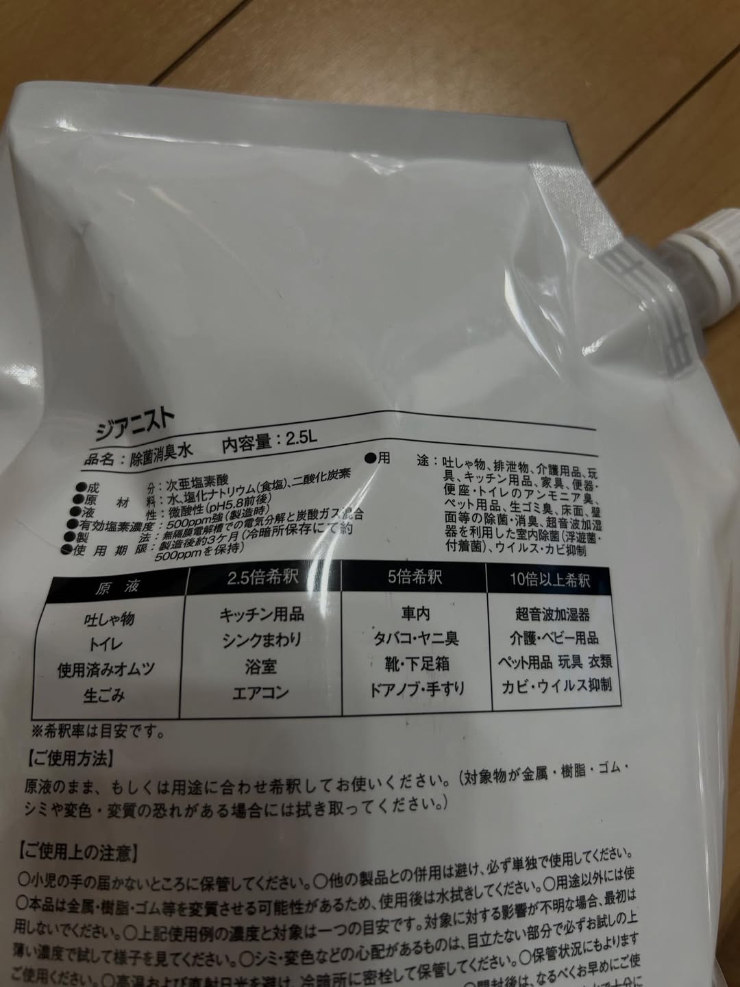 「ジアニスト」は浄水と塩を無隔膜電解槽で電気分解し製造した電解水を微細バブル発生ノズルに導通させ二酸化炭素を含有させたた超微細気泡含有微酸性次亜塩素酸水溶液「電解製法(6122139号等)」です。 出荷時の有効塩素濃度は500ppm強と高濃度の為、用途に応じ水道水で希釈し微酸性 次亜塩素酸水(pH5.8~6.5前後)としてお使い頂けます。吐しゃ物・ペットの汚物・カビ等の除菌・消臭には原液でもOK。10倍(約50ppm)に希釈すれば部屋中の幅広い拭取り除菌・消臭水(次亜塩素酸水)としてお使い頂けます。 専用の超音波噴霧器に10倍以上に希釈したジアニストを入れて使用すると空間除菌※も可能です。ジアニストはウイルスや菌(アルコール耐性のあるウイルス等)にも強く機能しますが、有機物に触れると水と約0.02%の塩に戻るため、清潔に使用したいものに幅広くお使いいただけます。 その他、多湿時のペットの獣臭や尿臭、トイレのアンモニア臭、タバコや汗の臭い、靴やスリッパの嫌な臭い、生ごみや洗濯物の生乾きなど、細菌の繁殖により発生する嫌な臭いにも効果があります。