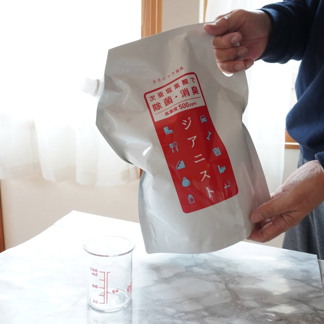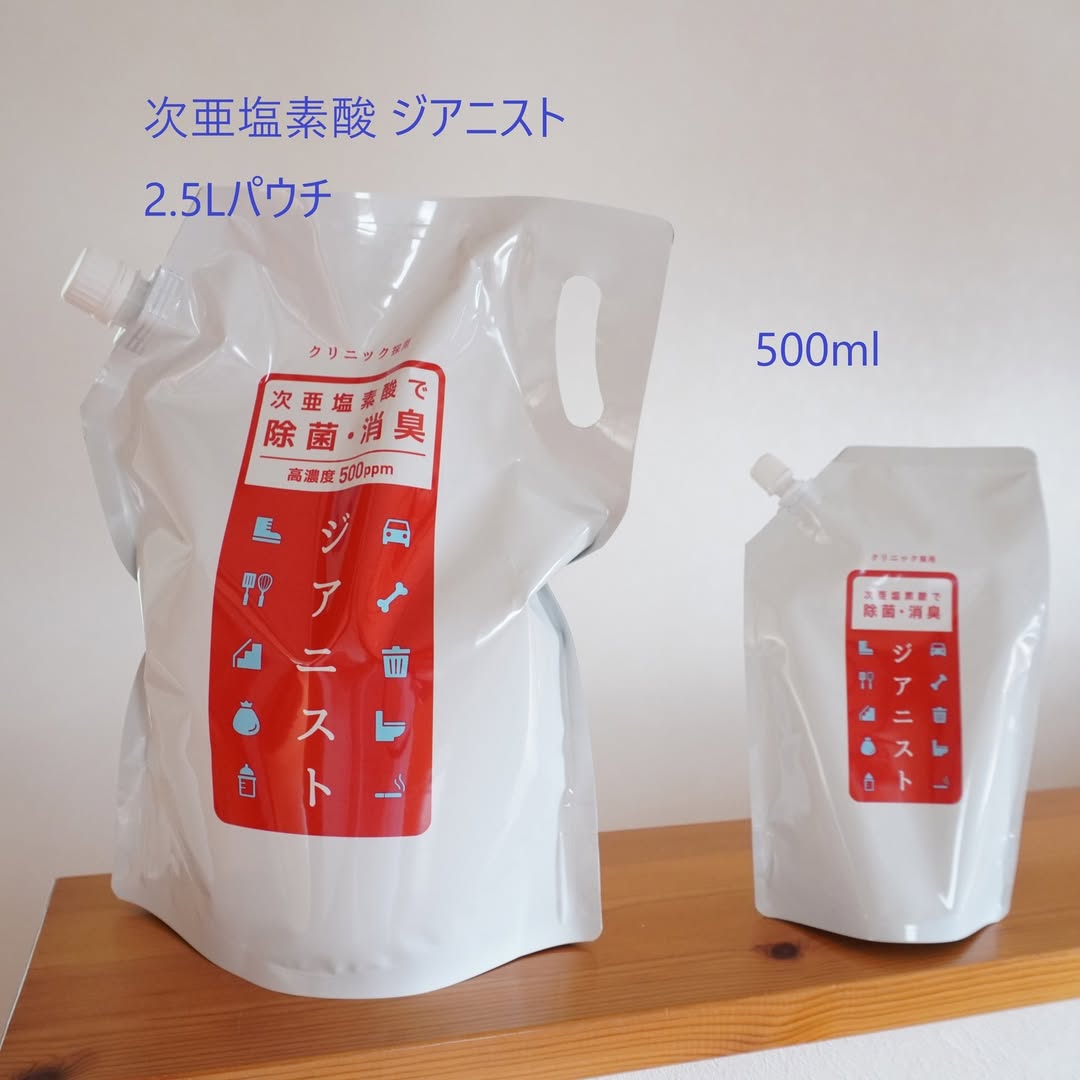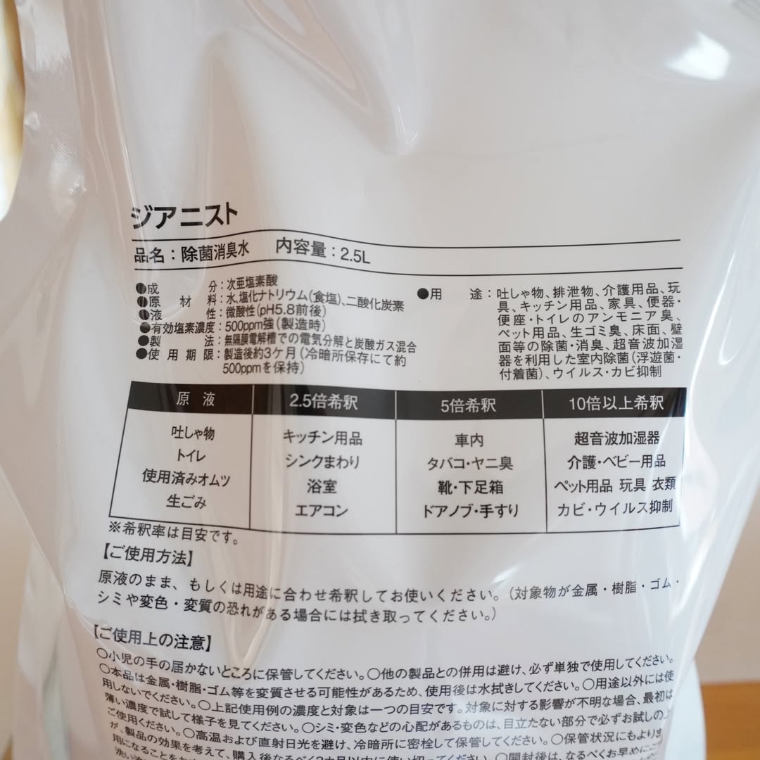 「ジアニスト」は浄水と塩を無隔膜電解槽で電気分解し製造した電解水を微細バブル発生ノズルに導通させ二酸化炭素を含有させたた超微細気泡含有微酸性次亜塩素酸水溶液「電解製法(6122139号等)」です。 出荷時の有効塩素濃度は500ppm強と高濃度の為、用途に応じ水道水で希釈し微酸性 次亜塩素酸水(pH5.8~6.5前後)としてお使い頂けます。吐しゃ物・ペットの汚物・カビ等の除菌・消臭には原液でもOK。10倍(約50ppm)に希釈すれば部屋中の幅広い拭取り除菌・消臭水(次亜塩素酸水)としてお使い頂けます。 専用の超音波噴霧器に10倍以上に希釈したジアニストを入れて使用すると空間除菌※も可能です。ジアニストはウイルスや菌(アルコール耐性のあるウイルス等)にも強く機能しますが、有機物に触れると水と約0.02%の塩に戻るため、清潔に使用したいものに幅広くお使いいただけます。 その他、多湿時のペットの獣臭や尿臭、トイレのアンモニア臭、タバコや汗の臭い、靴やスリッパの嫌な臭い、生ごみや洗濯物の生乾きなど、細菌の繁殖により発生する嫌な臭いにも効果があります。