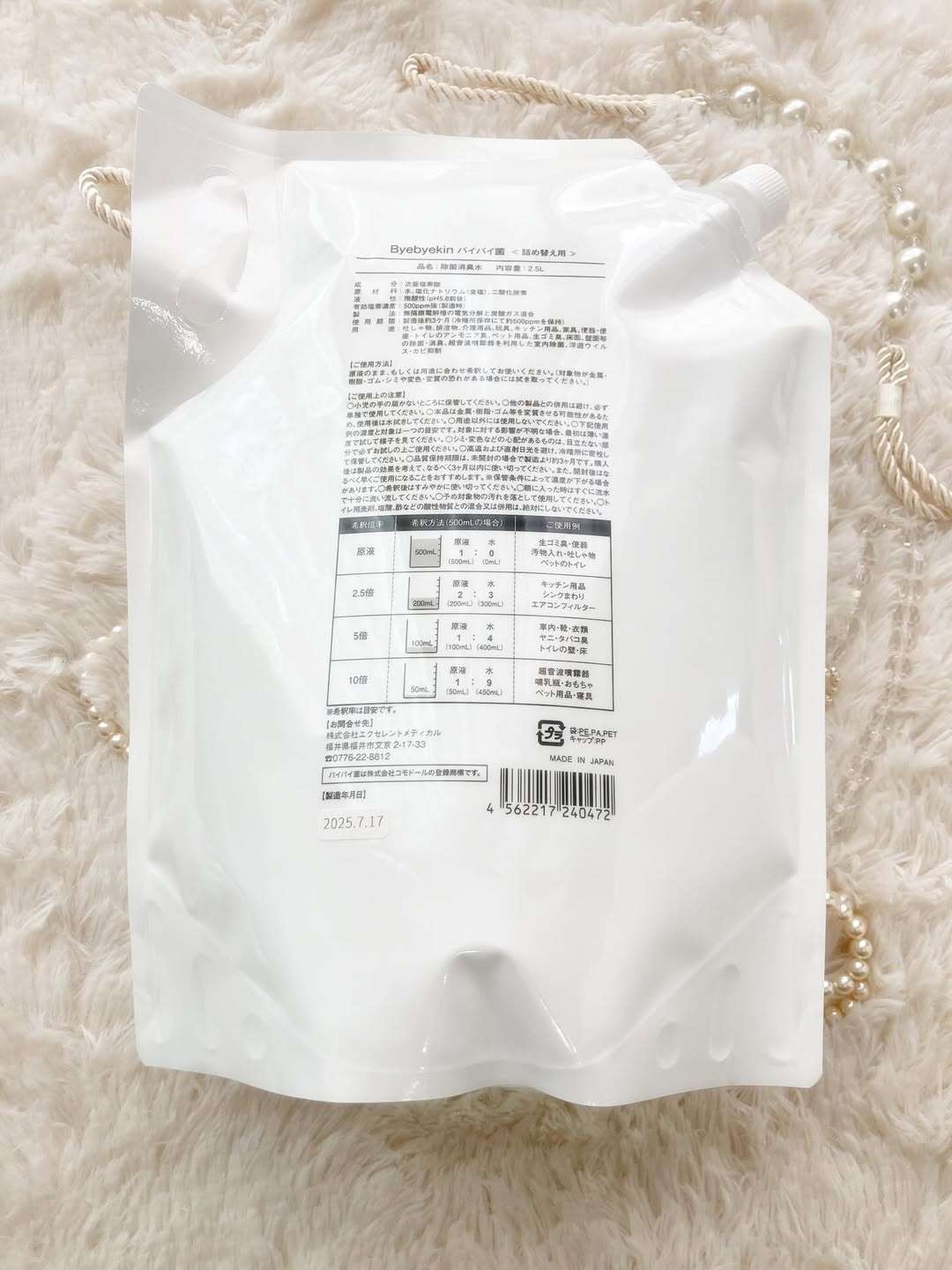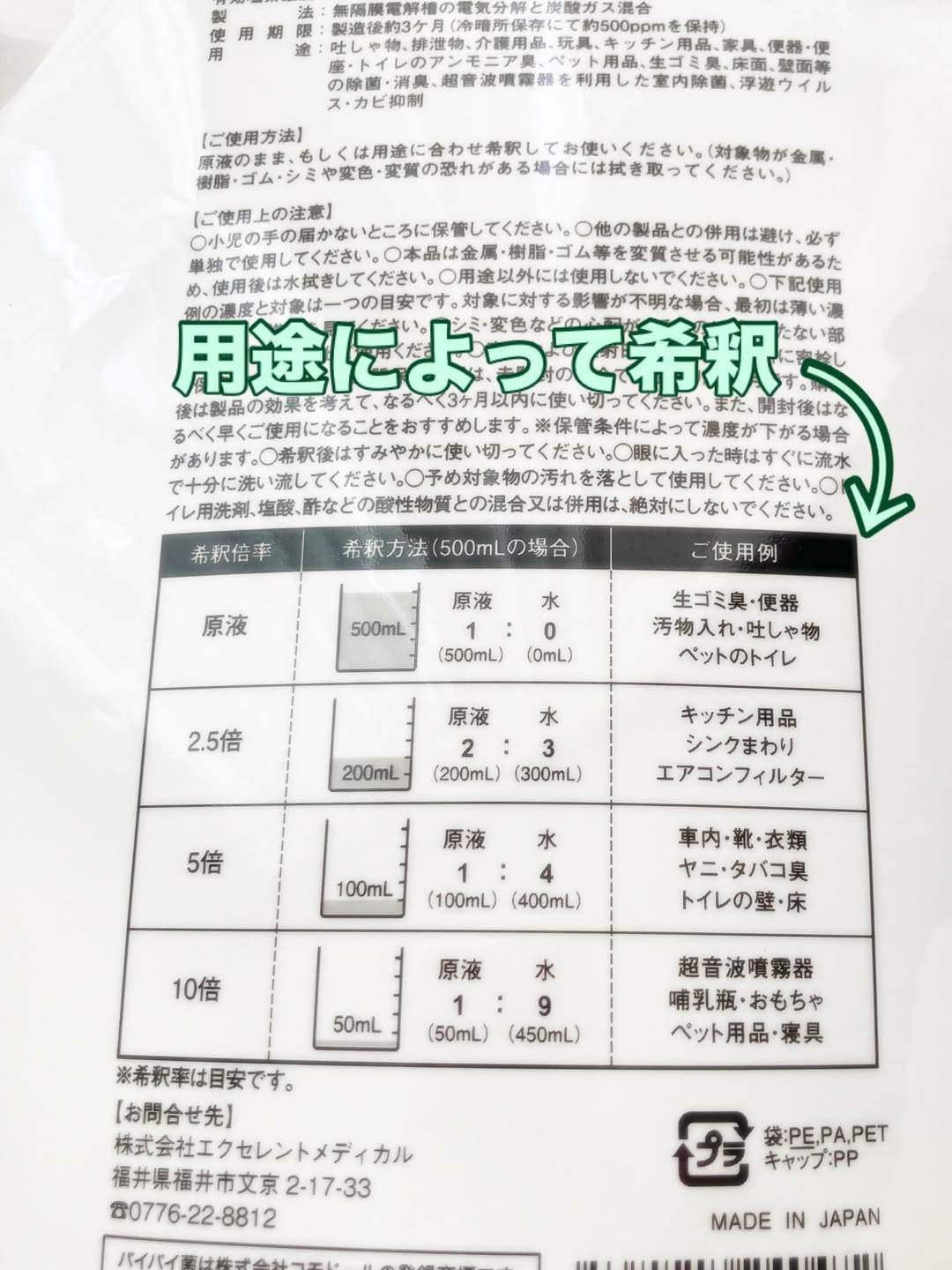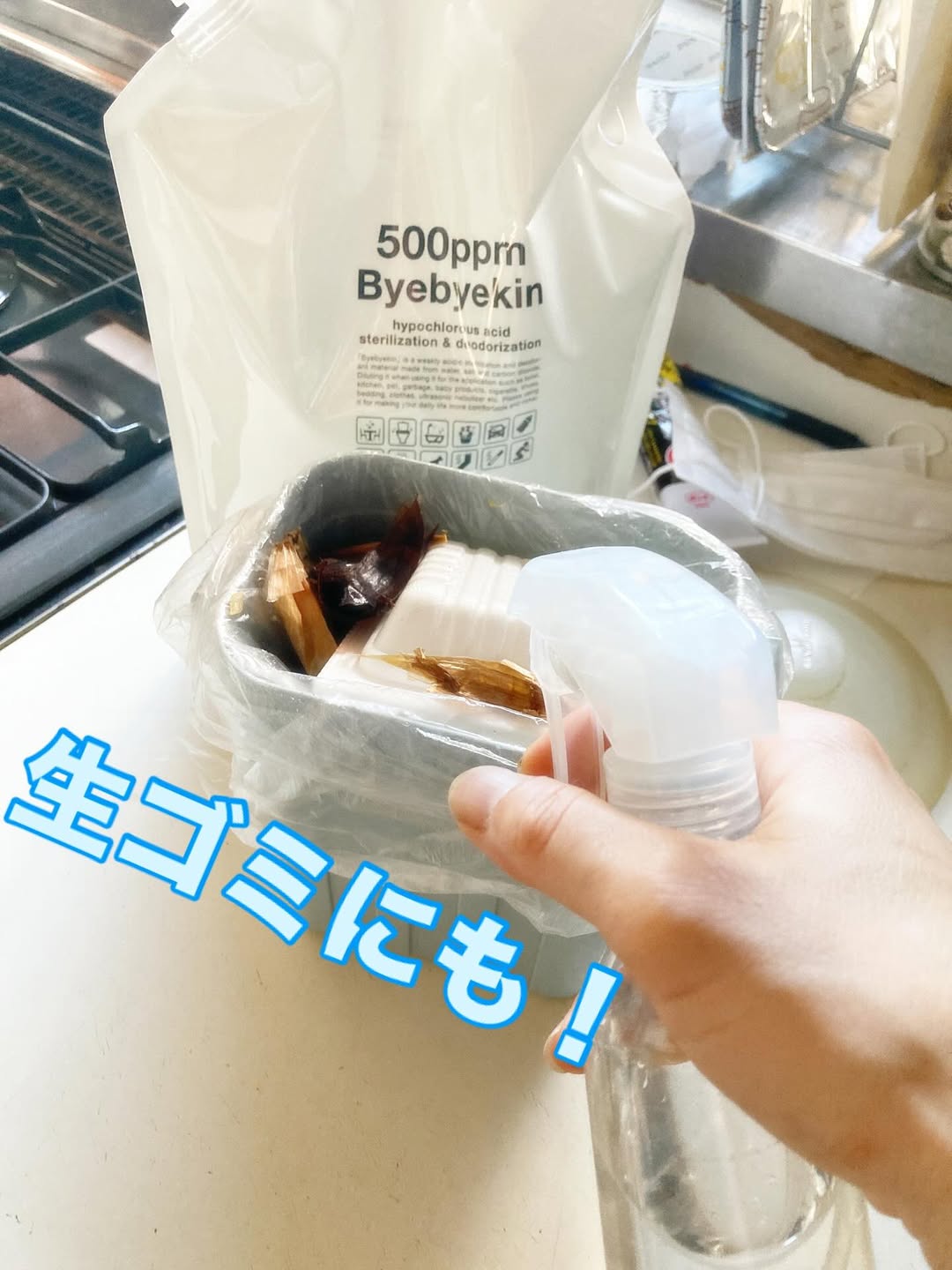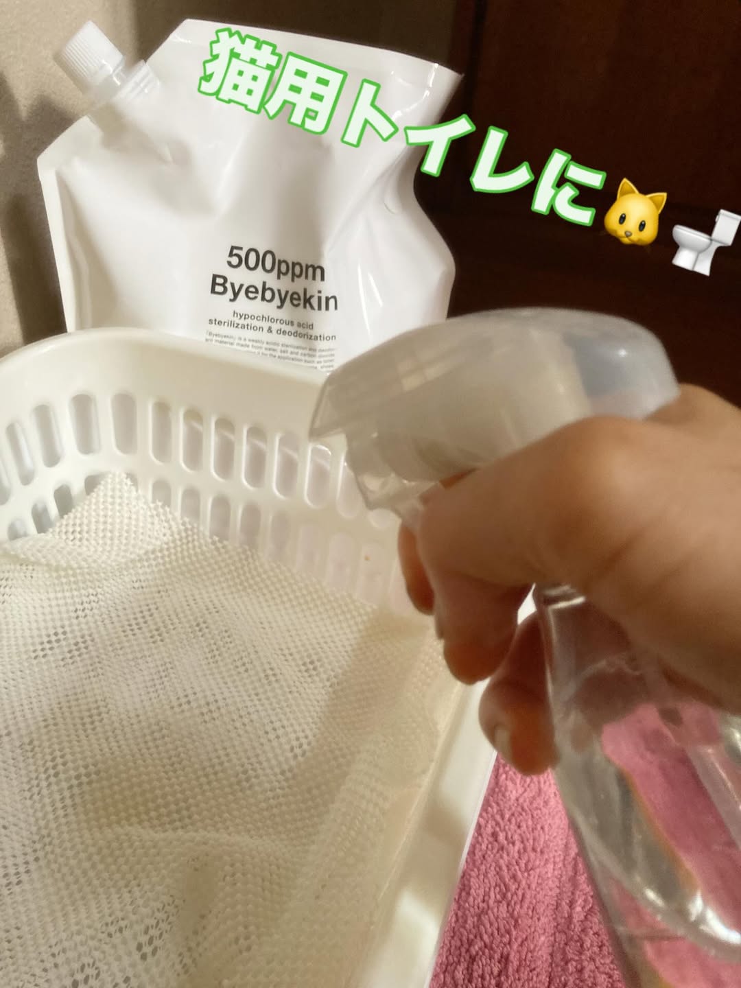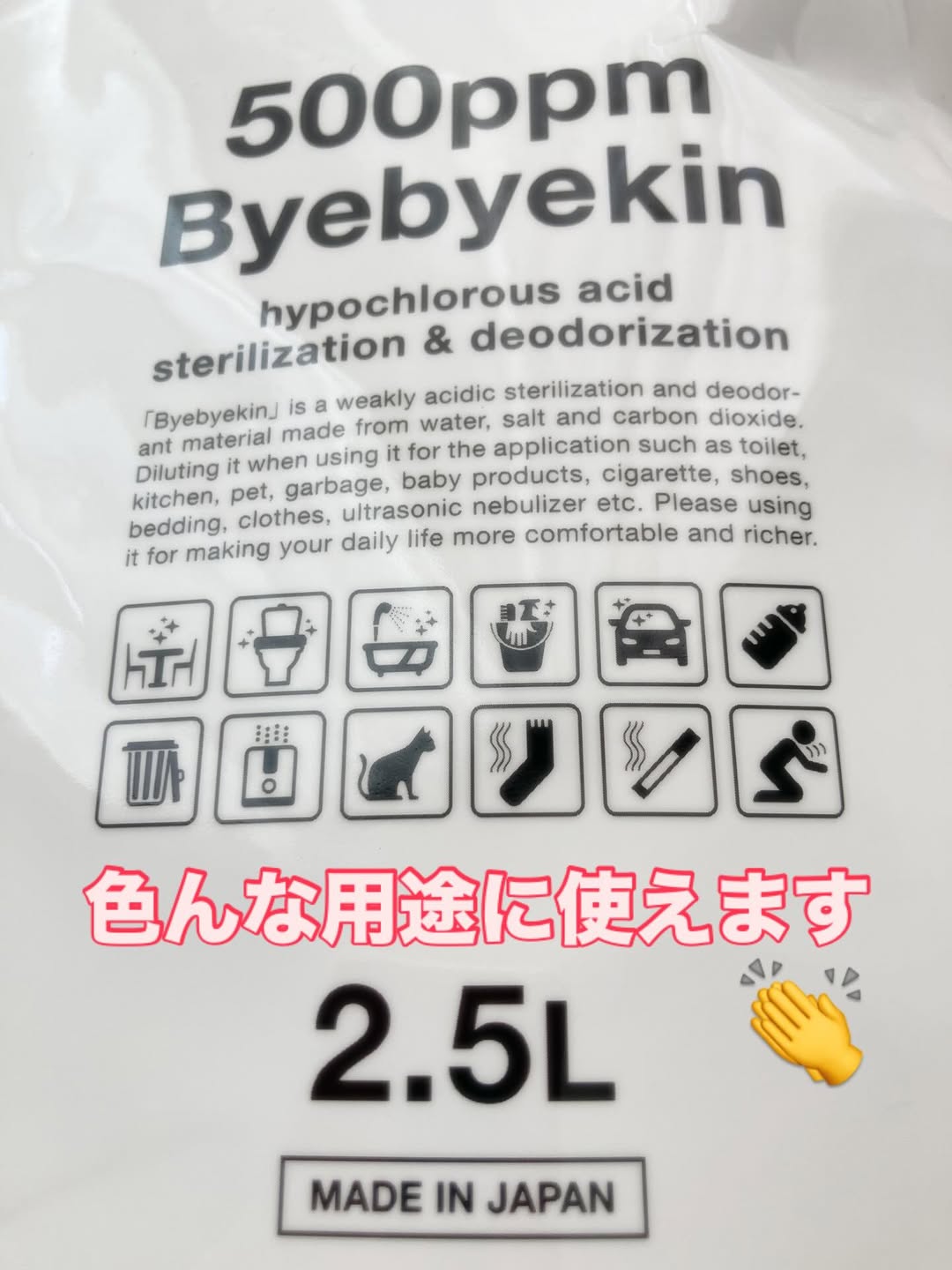 「バイバイ菌」は次亜塩素酸 (製造時500ppm強) 高濃度希釈タイプ 強力除菌・消臭水。無隔膜電解槽で電気分解して製造した電解水に炭酸をバブリングして製造した次亜塩素酸(500ppm強)です。 嘔吐物の処理は原液が有効ですが、2.5倍に希釈してキッチン回り、5倍希釈でトイレ回り、さらに10倍に希釈すると、赤ちゃん用品・介護用品の除菌消臭や、専用の超音波噴霧器を使った室内除菌等さまざまな用途にご利用頂けます。 次亜塩素酸水溶液は有機物に触れるとウイルスや菌を分解し、最後は水に戻りますので自然にも優しくなっております。 ※水道水で10倍希釈の次亜塩素酸において2ml中0.0004gの塩や水道水のミネラル分が残りますので、除菌後は拭取って頂くとよいです。 ※本品は「次亜塩素酸ナトリウム」ではなく「微酸性の次亜塩素酸水溶液」です。10倍に希釈したバイバイ菌は食品添加物規格基準(微酸性次亜塩素酸水)を同等基準である事を確認しております。(食品分析センターにて確認)
