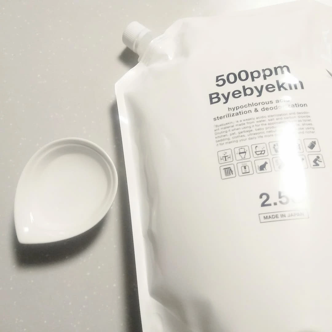 「バイバイ菌」は次亜塩素酸 (製造時500ppm強) 高濃度希釈タイプ 強力除菌・消臭水。無隔膜電解槽で電気分解して製造した電解水に炭酸をバブリングして製造した次亜塩素酸(500ppm強)です。 嘔吐物の処理は原液が有効ですが、2.5倍に希釈してキッチン回り、5倍希釈でトイレ回り、さらに10倍に希釈すると、赤ちゃん用品・介護用品の除菌消臭や、専用の超音波噴霧器を使った室内除菌等さまざまな用途にご利用頂けます。 次亜塩素酸水溶液は有機物に触れるとウイルスや菌を分解し、最後は水に戻りますので自然にも優しくなっております。 ※水道水で10倍希釈の次亜塩素酸において2ml中0.0004gの塩や水道水のミネラル分が残りますので、除菌後は拭取って頂くとよいです。 ※本品は「次亜塩素酸ナトリウム」ではなく「微酸性の次亜塩素酸水溶液」です。10倍に希釈したバイバイ菌は食品添加物規格基準(微酸性次亜塩素酸水)を同等基準である事を確認しております。(食品分析センターにて確認)