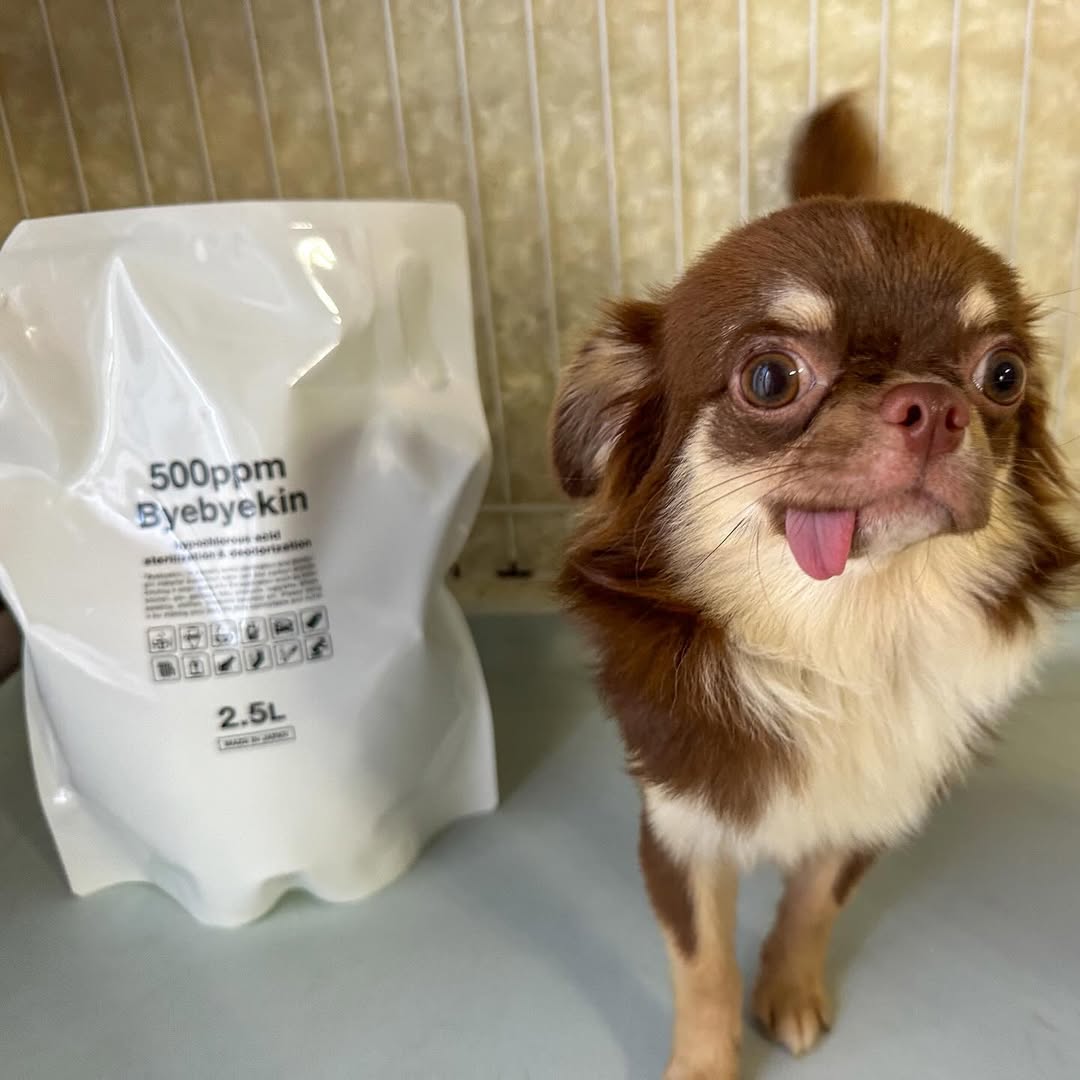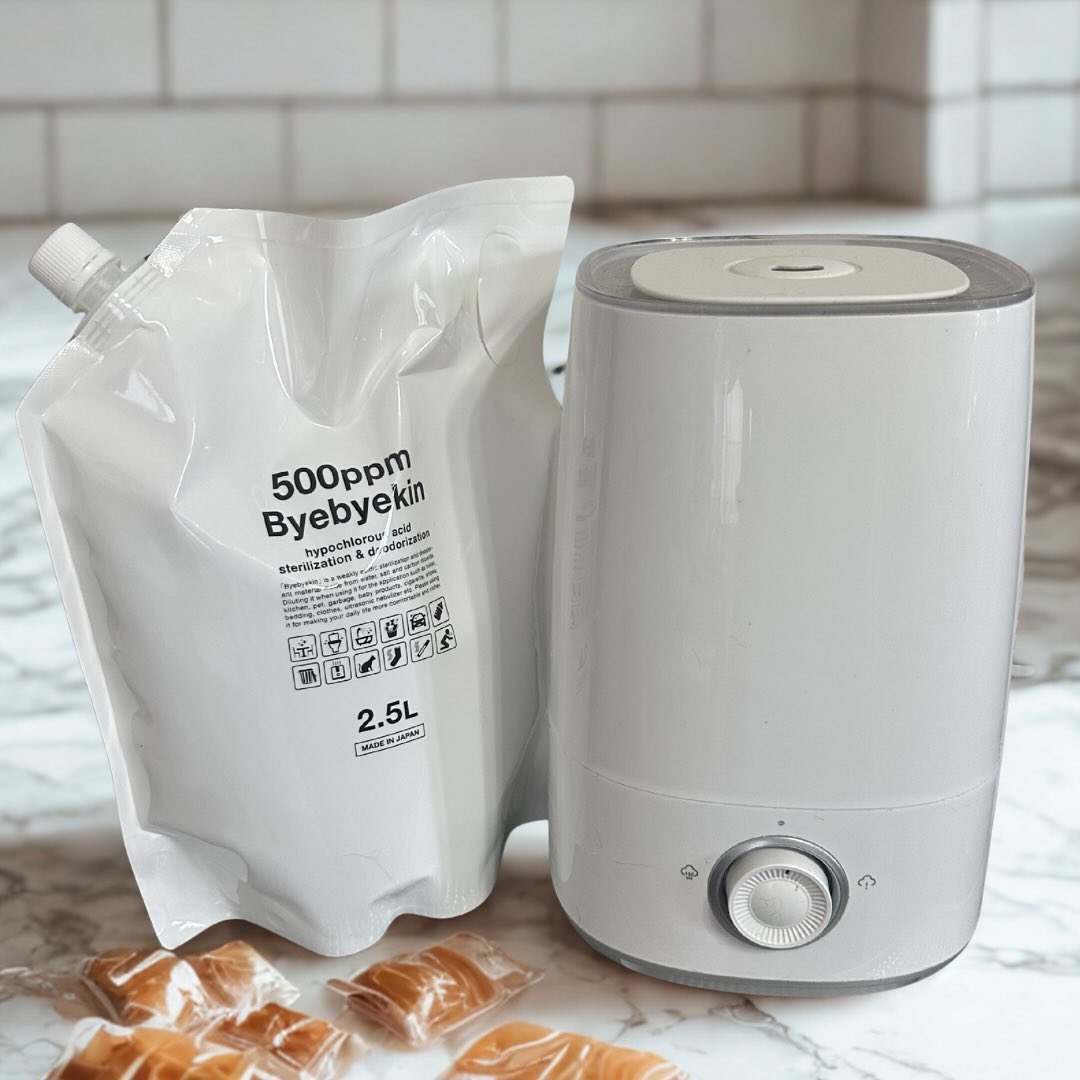 「バイバイ菌」は次亜塩素酸 (製造時500ppm強) 高濃度希釈タイプ 強力除菌・消臭水。無隔膜電解槽で電気分解して製造した電解水に炭酸をバブリングして製造した次亜塩素酸(500ppm強)です。 嘔吐物の処理は原液が有効ですが、2.5倍に希釈してキッチン回り、5倍希釈でトイレ回り、さらに10倍に希釈すると、赤ちゃん用品・介護用品の除菌消臭や、専用の超音波噴霧器を使った室内除菌等さまざまな用途にご利用頂けます。 次亜塩素酸水溶液は有機物に触れるとウイルスや菌を分解し、最後は水に戻りますので自然にも優しくなっております。 ※水道水で10倍希釈の次亜塩素酸において2ml中0.0004gの塩や水道水のミネラル分が残りますので、除菌後は拭取って頂くとよいです。 ※本品は「次亜塩素酸ナトリウム」ではなく「微酸性の次亜塩素酸水溶液」です。10倍に希釈したバイバイ菌は食品添加物規格基準(微酸性次亜塩素酸水)を同等基準である事を確認しております。(食品分析センターにて確認)