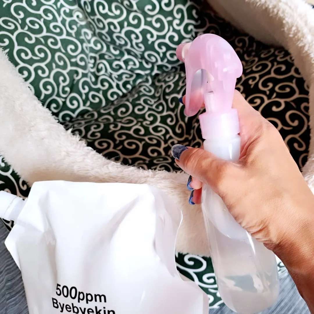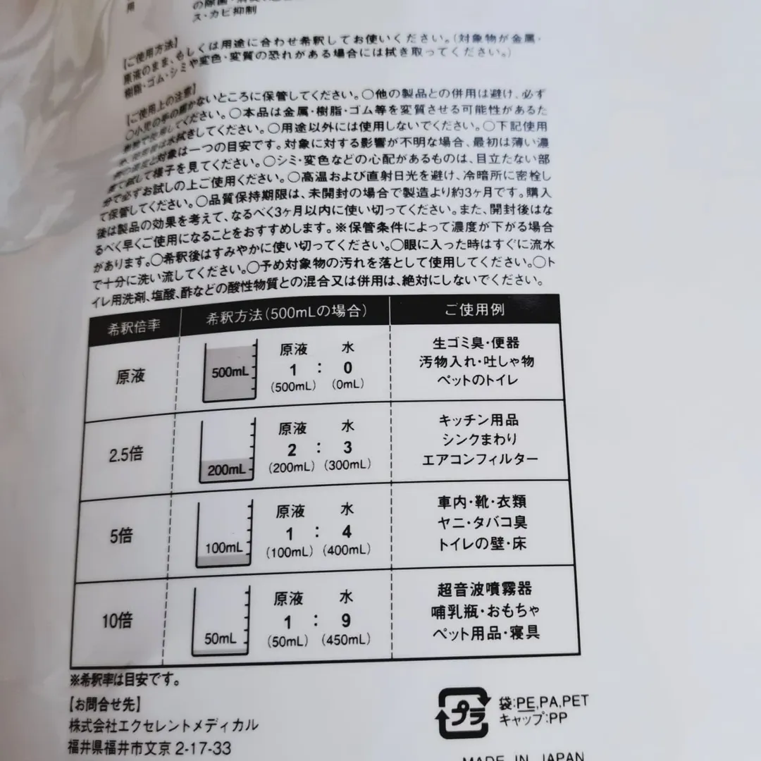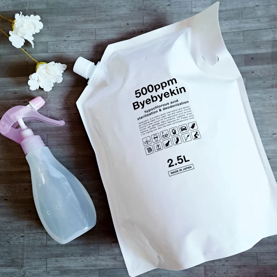 「バイバイ菌」は次亜塩素酸 (製造時500ppm強) 高濃度希釈タイプ 強力除菌・消臭水。無隔膜電解槽で電気分解して製造した電解水に炭酸をバブリングして製造した次亜塩素酸(500ppm強)です。 嘔吐物の処理は原液が有効ですが、2.5倍に希釈してキッチン回り、5倍希釈でトイレ回り、さらに10倍に希釈すると、赤ちゃん用品・介護用品の除菌消臭や、専用の超音波噴霧器を使った室内除菌等さまざまな用途にご利用頂けます。 次亜塩素酸水溶液は有機物に触れるとウイルスや菌を分解し、最後は水に戻りますので自然にも優しくなっております。 ※水道水で10倍希釈の次亜塩素酸において2ml中0.0004gの塩や水道水のミネラル分が残りますので、除菌後は拭取って頂くとよいです。 ※本品は「次亜塩素酸ナトリウム」ではなく「微酸性の次亜塩素酸水溶液」です。10倍に希釈したバイバイ菌は食品添加物規格基準(微酸性次亜塩素酸水)を同等基準である事を確認しております。(食品分析センターにて確認)