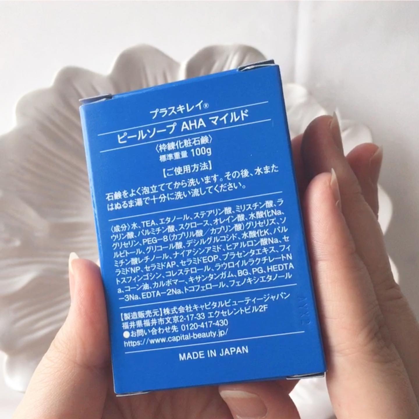 皮膚の専門家により開発されたピーリング(※1)石鹸が「プラスキレイ ピールソープ AHA」です。くすみ(※2)や黒ずみ(※2)が気になる方やニキビ予防(※3)にお悩みの方へもおすすめです。 角質ケア成分AHA(グリコール酸)1.5%、パルミチン酸レチノール(ビタミンA誘導体)整肌成分、アドニスパレスチナ花エキス(保湿成分)、ティートゥリーオイル(整肌成分)を配合、その他 ナイアシンアミド、ヒト型セラミド、プラセンタエキス、ヒアルロン酸Na 等の製肌成分も医師監修の上ベストバランス配合を実現。 古い角質をはじめとした不要な汚れをしっかりと落とし、美容成分が届きやすいよう肌のリズムを整えます。ピーリング(※1)中級者から上級者の方、ちょっと強めの角質ケアをしたい方向けの商品です。より効果を発揮する為の泡パックとしてもお使い頂けます。 熟練した職人による枠練製法にもこだわり丁寧に生産されたピーリング(※1)石鹸です。 (※1)古い角質・余分な皮脂を洗い落とし、肌を清潔に保つこと (※2)古い角質を含む汚れのこと (※3)洗顔による