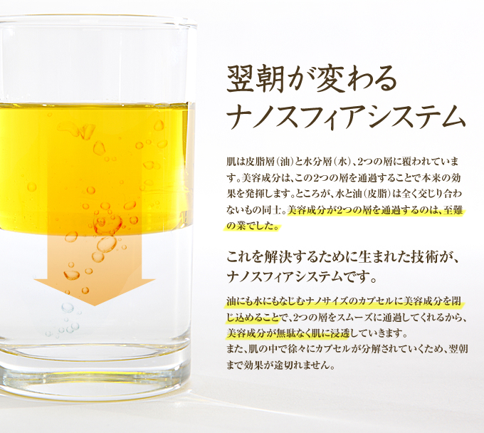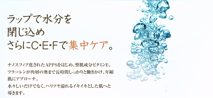 うるおいベールで肌をやさしく包み込む機能性保湿クリーム。 5種類のペプチドが気になる目もと・口もとにもっちりとした弾力とハリを与え、 4種類のビタミン誘導体「APPS」「EPC」「VCエチル」「TPNa」が肌にツヤと透明感を与え、乾燥を防ぎます。皮脂にも水にもなじむナノサイズのカプセルに、美容成分を閉じ込めるナノスフィアシステムを採用。肌の皮脂層と水分層をスムーズに通過し、無駄なく肌に届きます。また、カプセルが肌の中で徐々に分解されていくため、作用が長時間持続します。