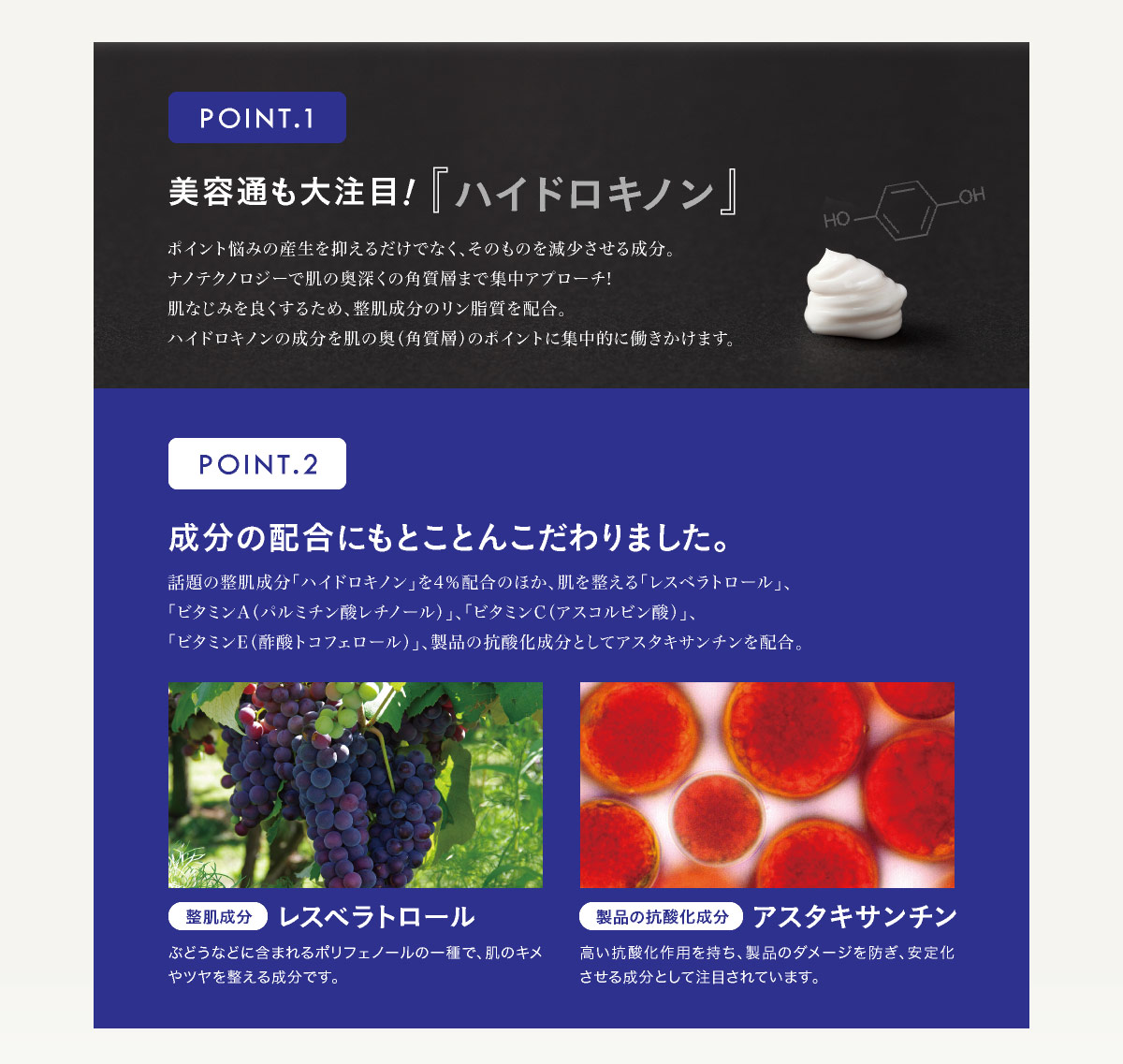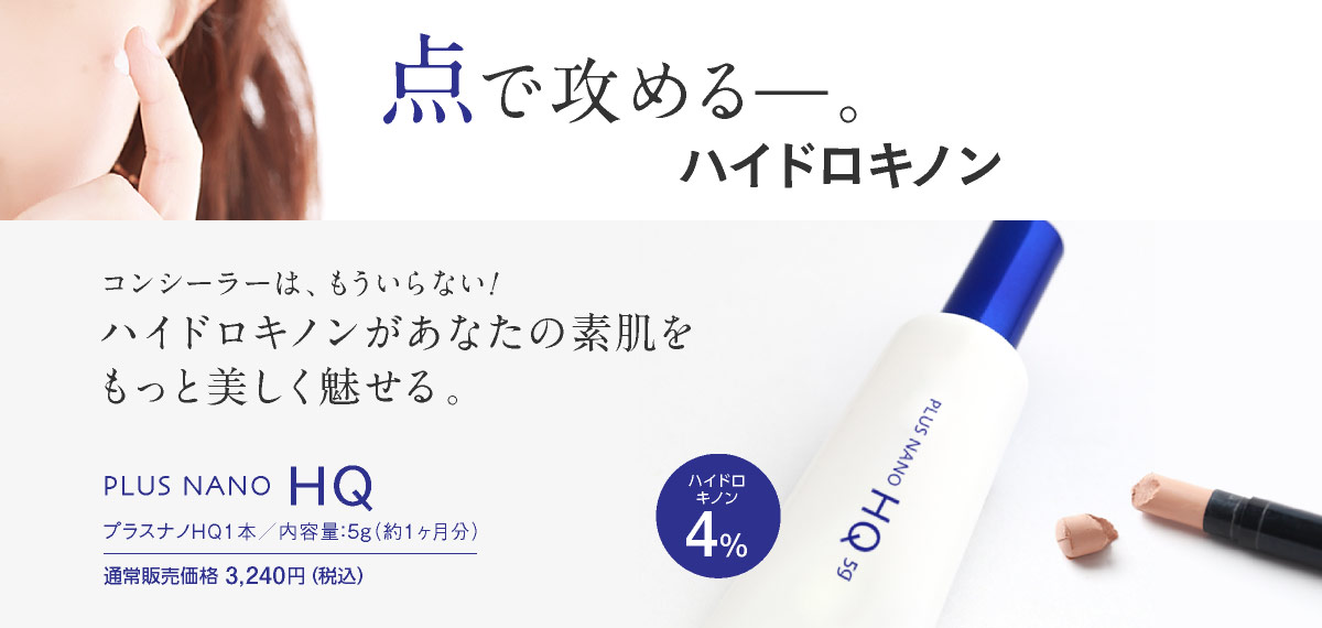 プラスキレイのプラスナノHQのクリームは、話題のハイドロキノンを4%配合したポイント集中ブライトングケア用のクリームです。ハイドロキノンをナノカプセル化した事により、肌の奥深くターゲットポイントまで高濃度でのアプローチを実現しました。いつものお手入れにプラスするだけで、白絹のような無地肌へと導きます。