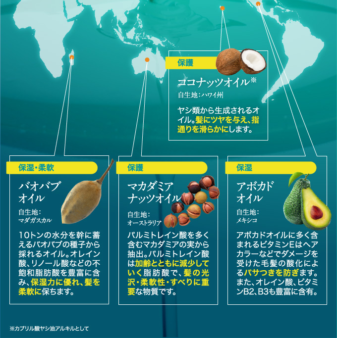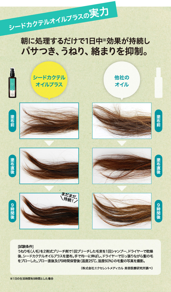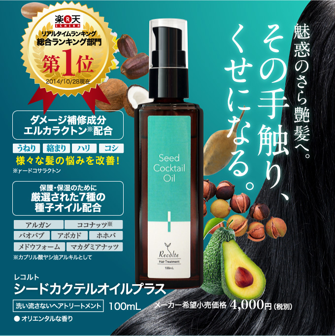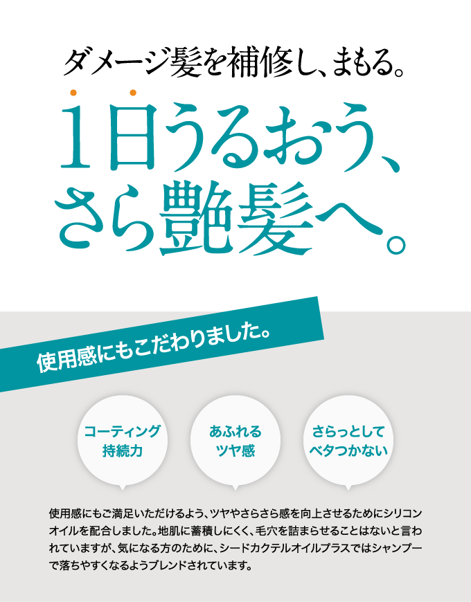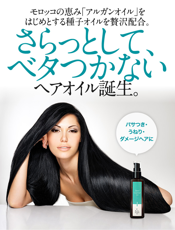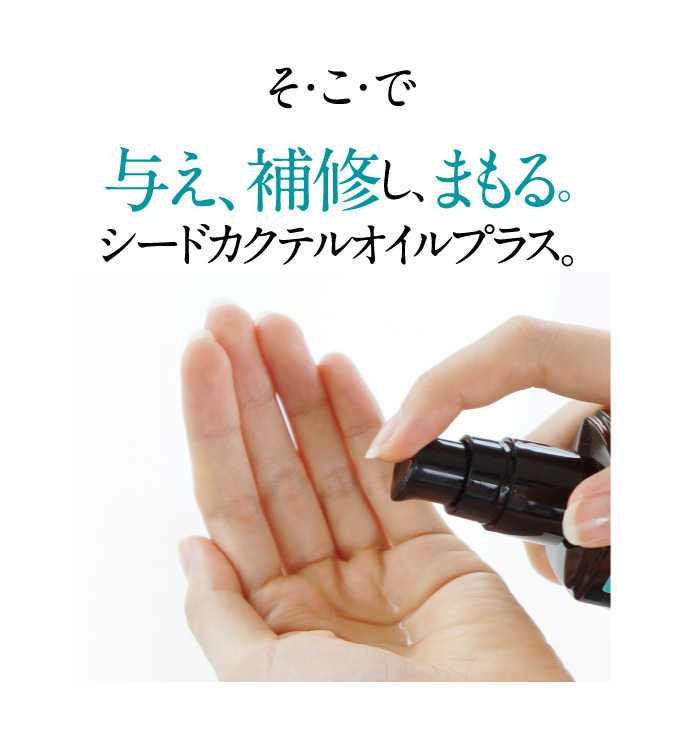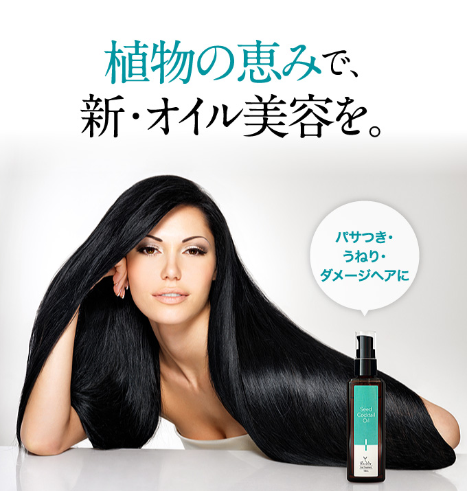 優れた毛髪補修・保護機能をもつ数種類の種子オイルを独自の 配合比率でブレンドしたヘアオイル(洗い流さないヘアトリートメント)です。