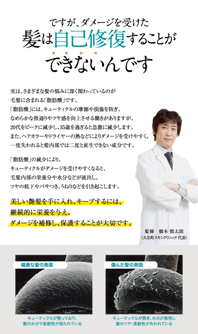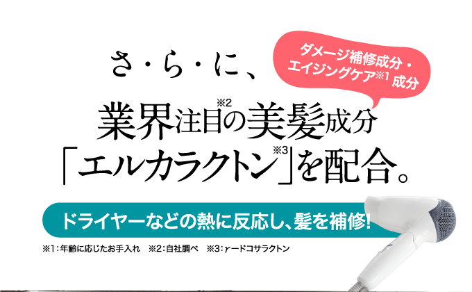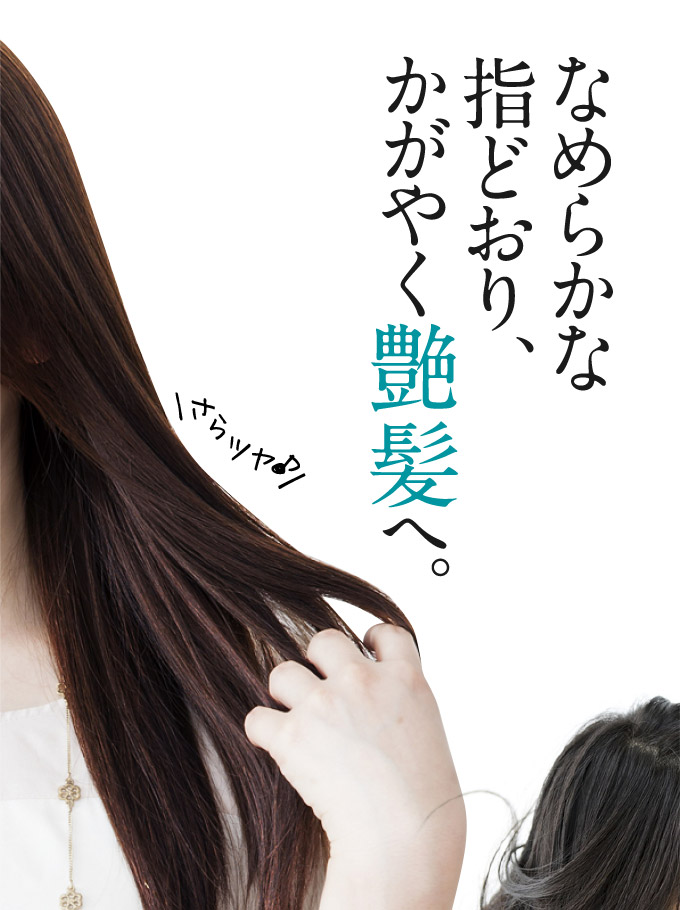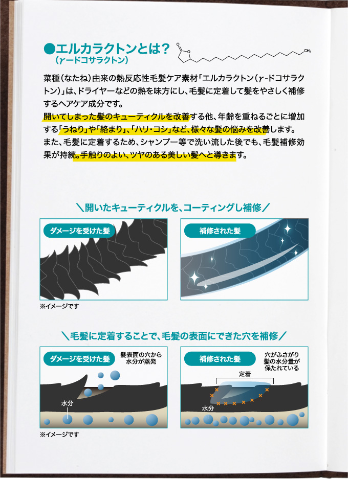 髪に大切な水分と油分を閉じ込め、パサつきを防ぐだけでなく、 紫外線などの外的ダメージから髪を守ります。 さらに、業界注目成分エルカラクトンが キューティクルや蓄積された毛髪ダメージを補修。 うねりや絡まり、ハリ・コシなど、様々な髪の悩みを改善します。