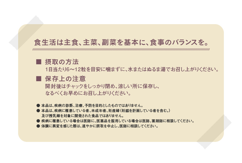 1日当たり6粒を目安に噛まずに、水またはぬるま湯でお召し上がりください。