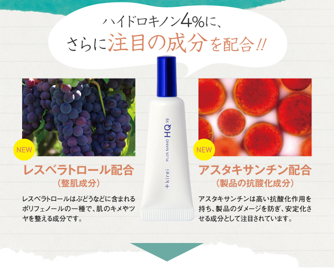 プラスキレイのプラスナノHQのクリームは、話題のハイドロキノンを4%、レスベラトロール1%、アスタキサンチン、さらにビタミンA、C、Eを配合したポイント集中ブライトングケア用のクリームです。