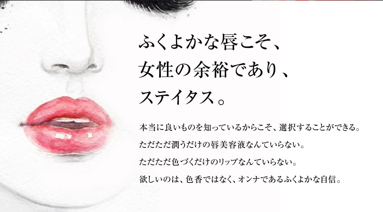 まるで「塗る、唇のヒアルロン酸注射」のように、塗ることで唇のシワ改善、ボリュームアップ、輪郭がはっきりします。