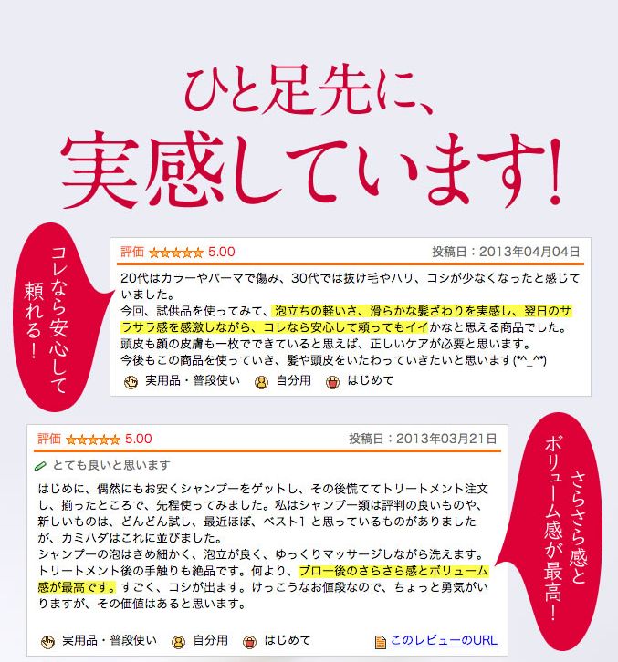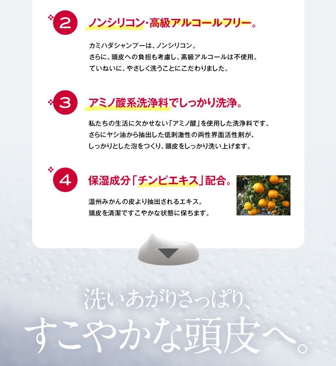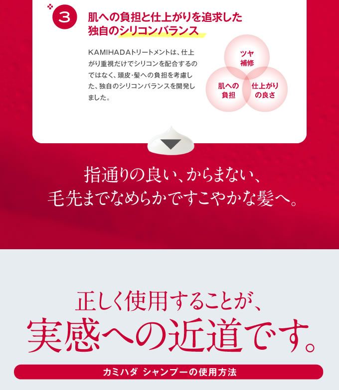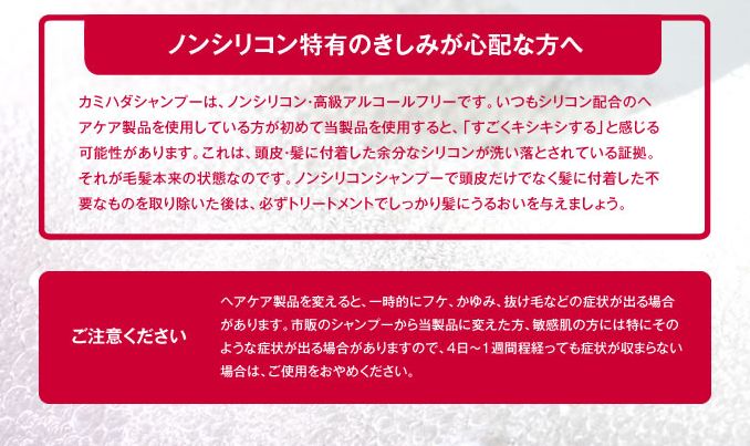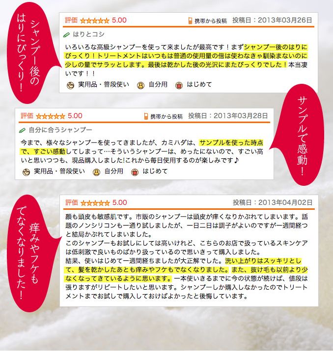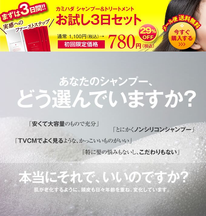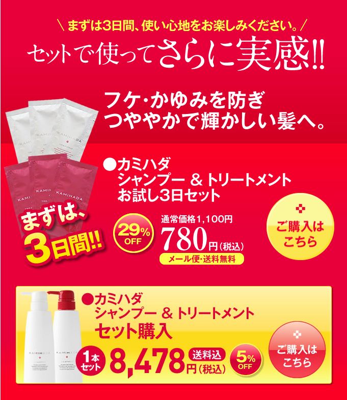 カミハダ シャンプー&トリートメント お試し3日セットを使ってみましたさすが、ノンシリコンシャンプーの洗い上がりからして髪の毛がするっとしてからみつきませんさらにトリートメントでしっとりコロのバサっとした髪の毛が少し艶がでてしなやかになりますこの暑いなか、いつも出てしまう頭皮の湿疹もありませ… 2013/08/10