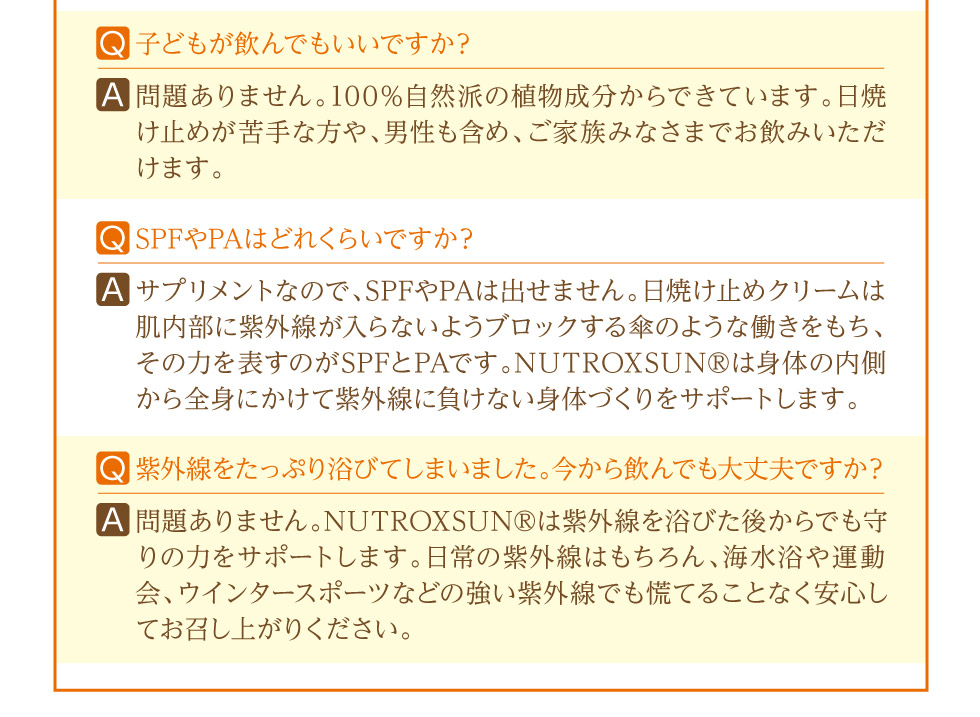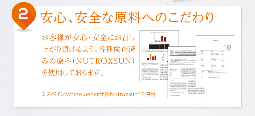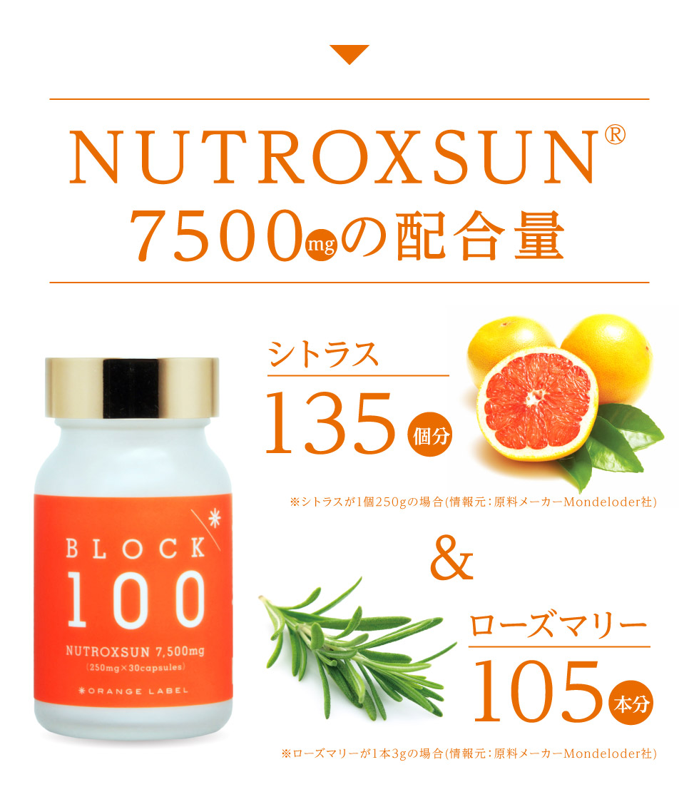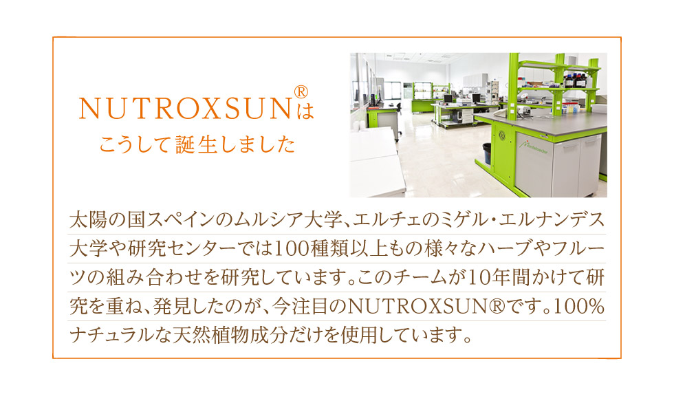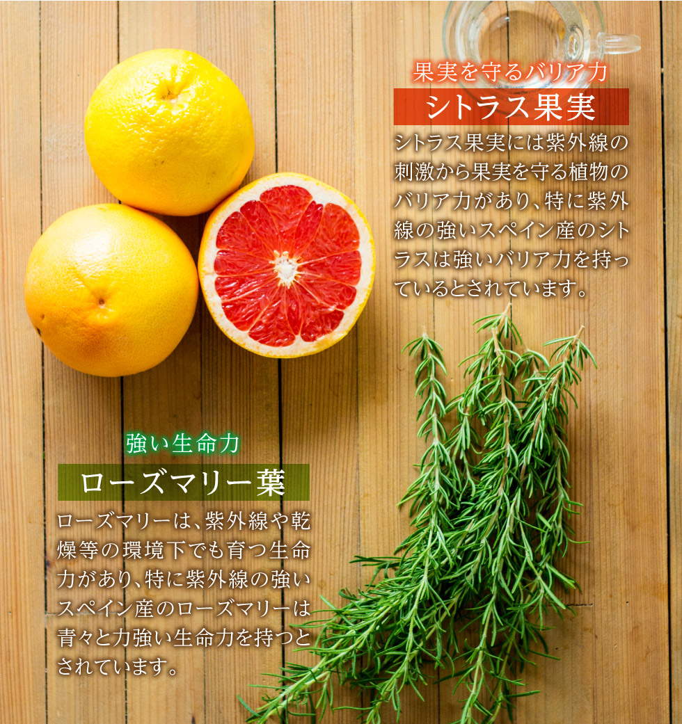 「シトラスの果実」、「ローズマリーの葉」から抽出して特殊配合された地中海スペイン生まれの天然ポリフェノール『ニュートロックスサン』100%配合。