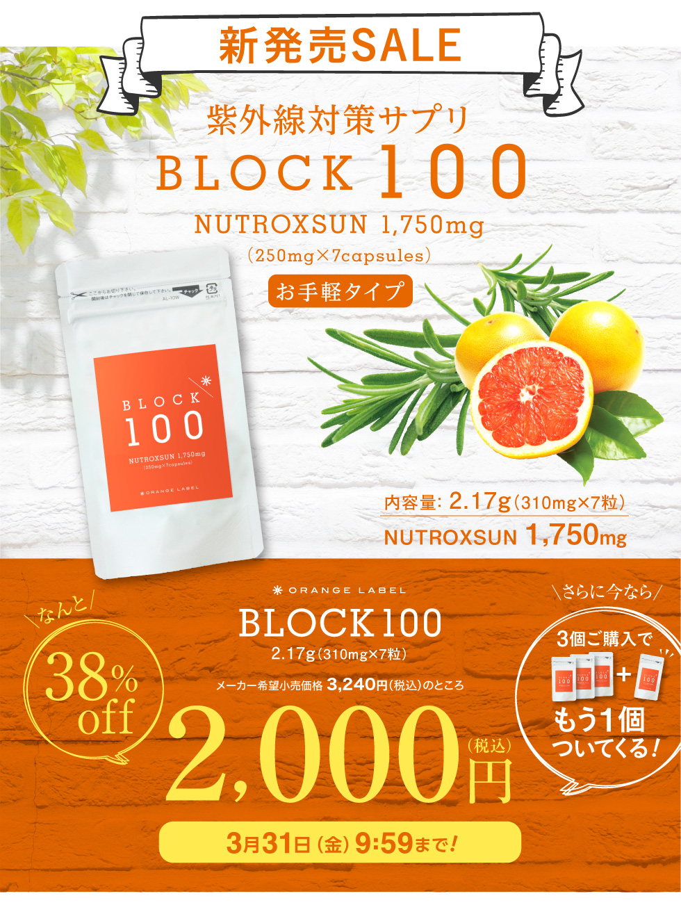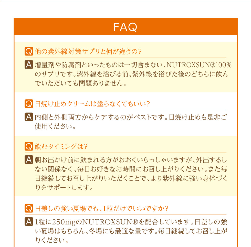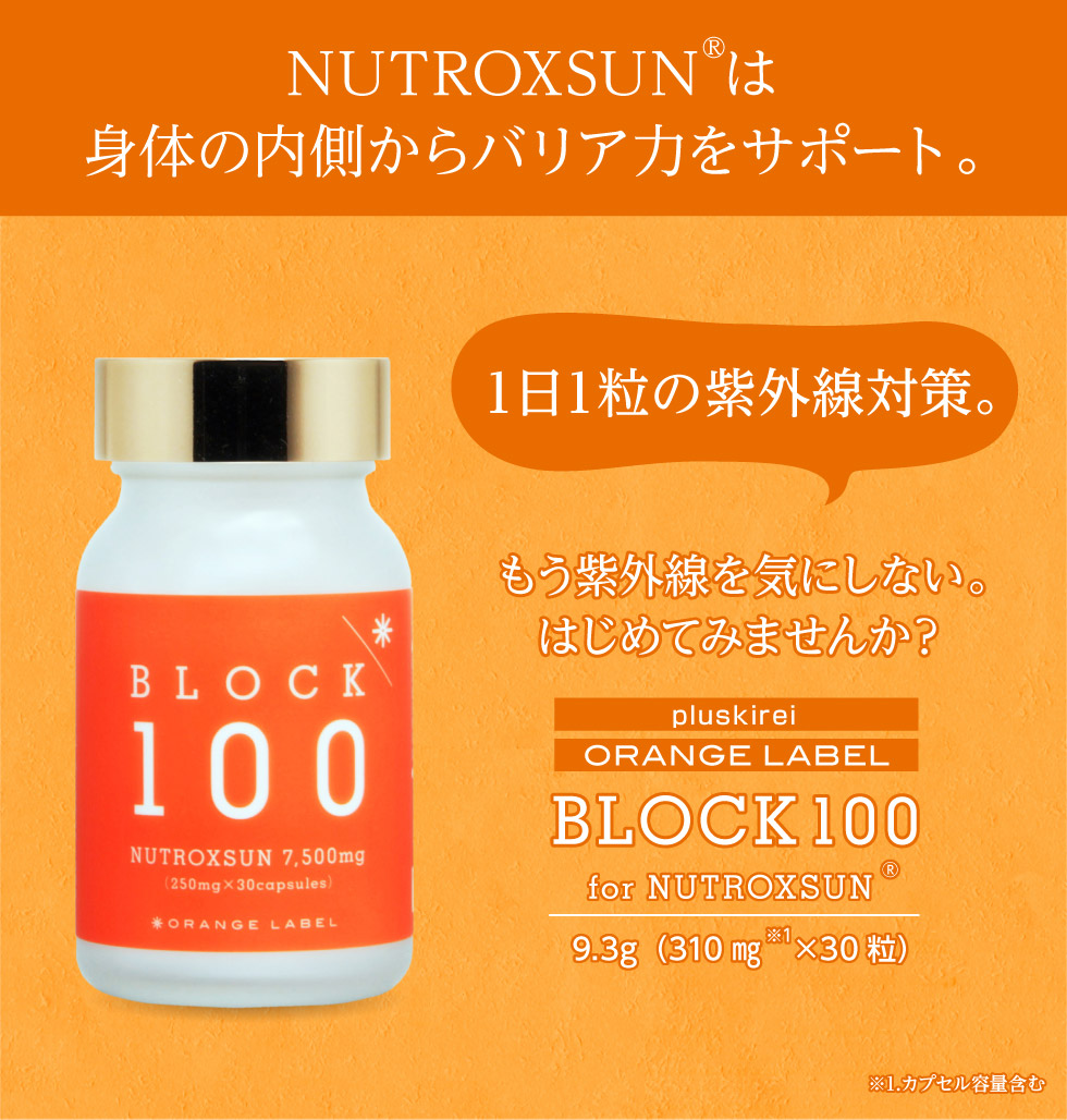 「シトラスの果実」、「ローズマリーの葉」から抽出して特殊配合された地中海スペイン生まれの天然ポリフェノール『ニュートロックスサン』100%配合。