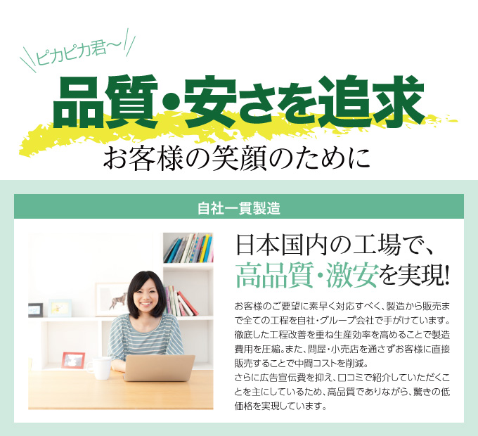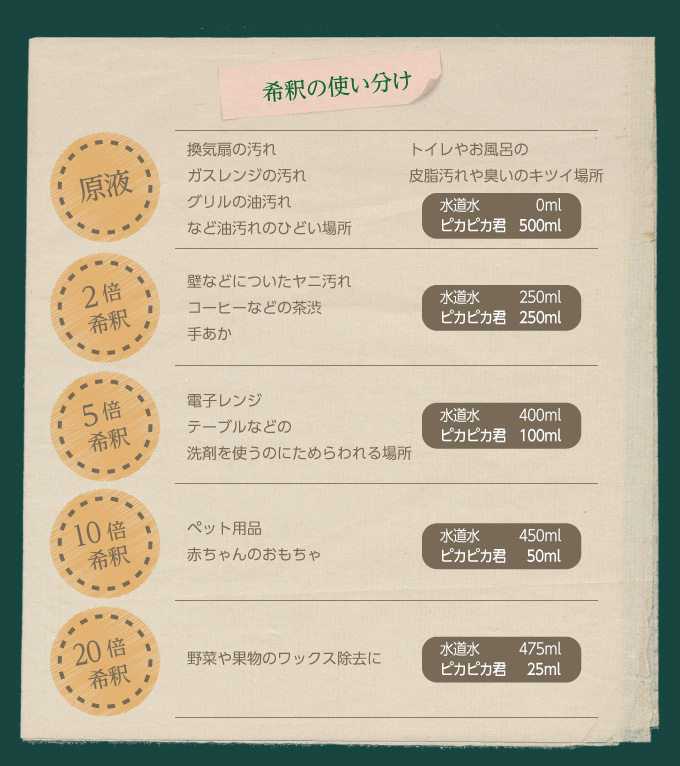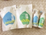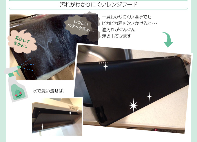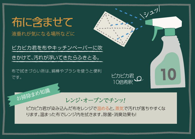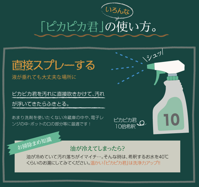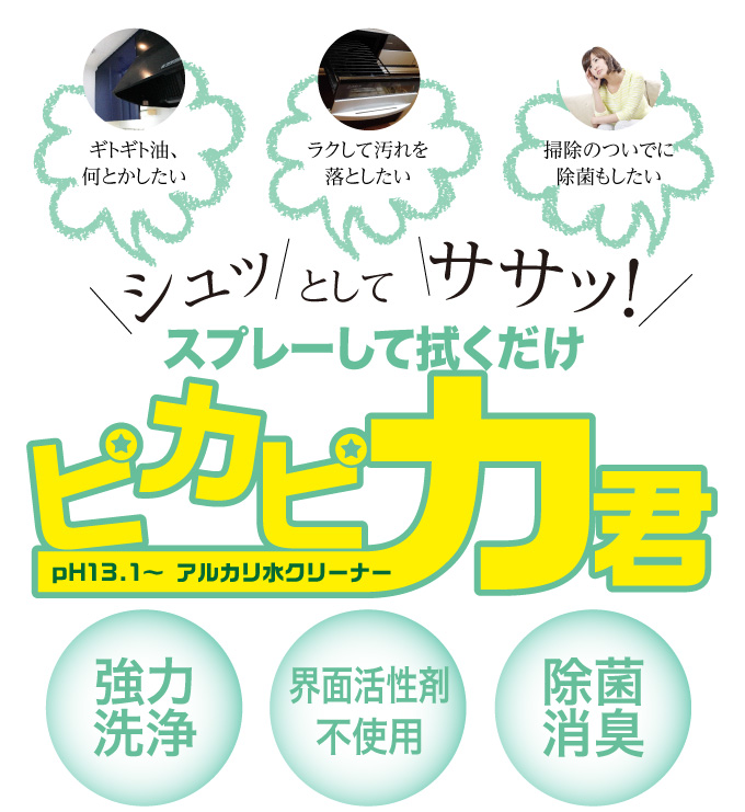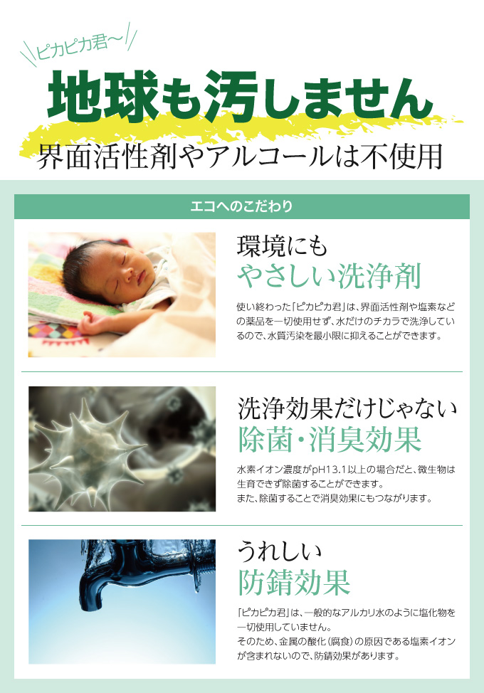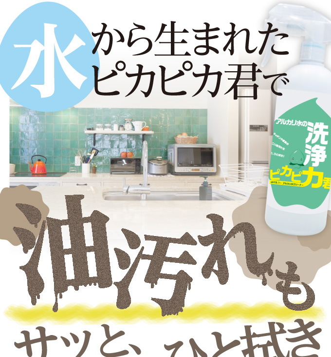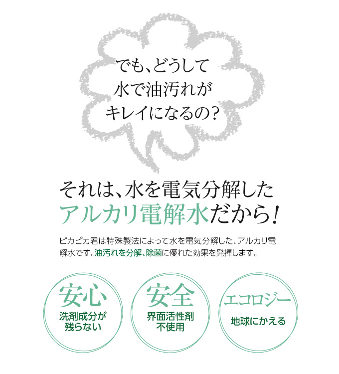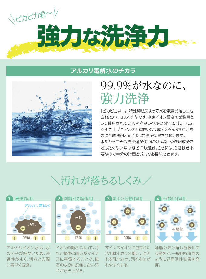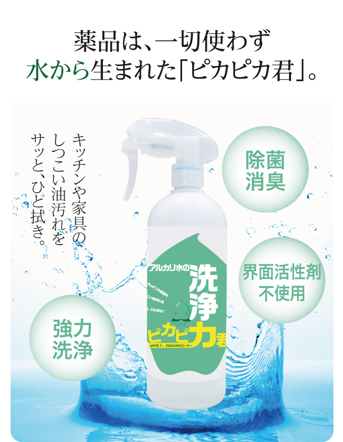 「ピカピカ君」は、特殊製法によって水を電気分解し生成されたアルカリ水洗剤です。水素イオン濃度を業務用として使用されている洗浄剤レベルのph13.1以上にまで引き上げたアルカリ電解水で、成分の99.9%が水なのに合成洗剤と同じような洗浄効果を発揮します。 水だからこそ合成洗剤が使いにくい場所や洗剤成分を残したくない場所などにも最適。さらに、2度拭き不要なので半分の時間と労力でお掃除できます。