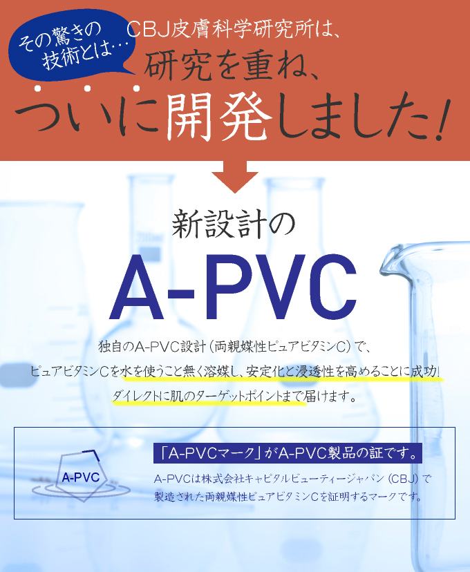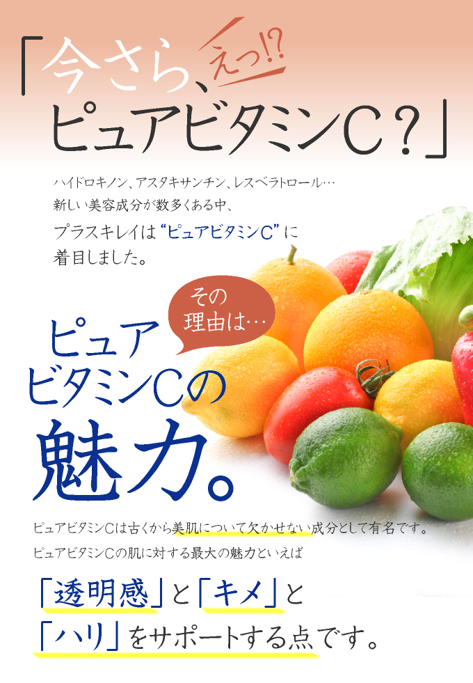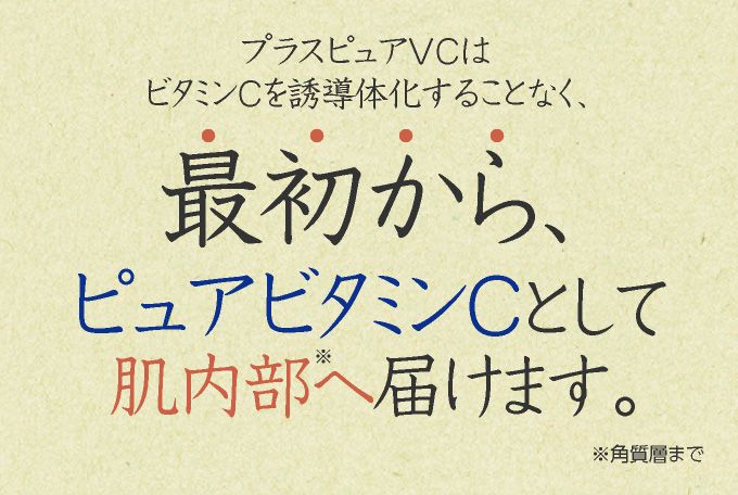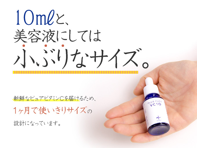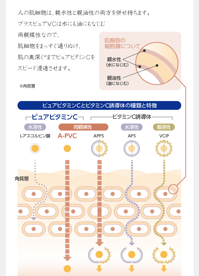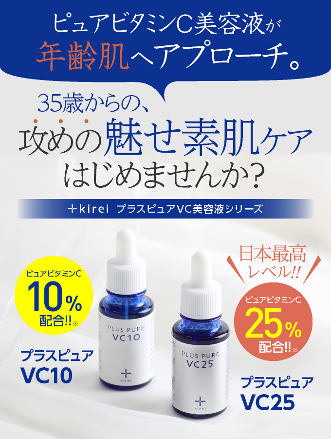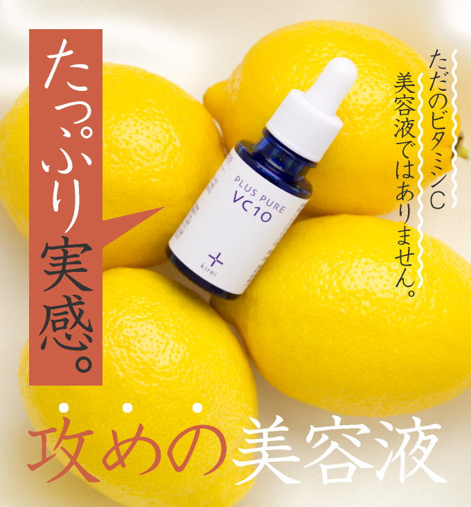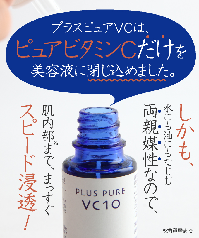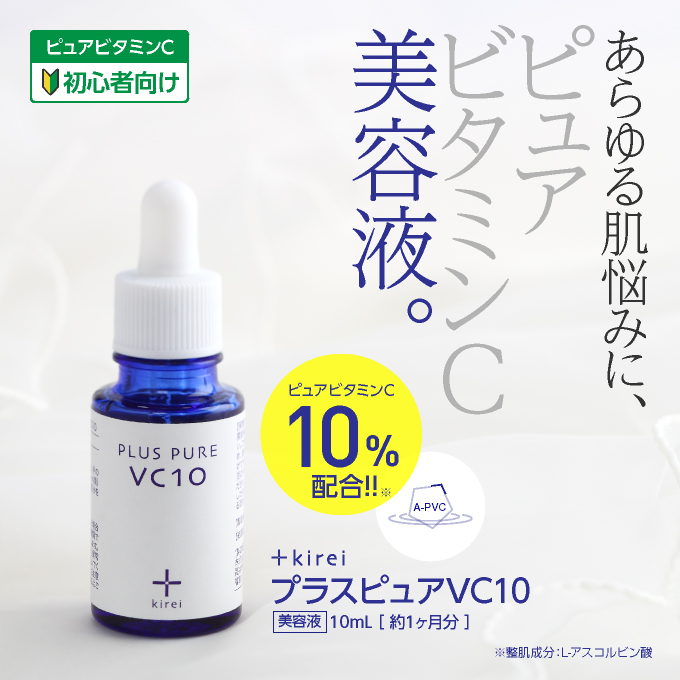 プラスキレイのプラスピュアVC10は、独自のA-PVC設計を用いて作られたピュアビタミンC10%配合の美容液です。A-PVC設計は両親媒性の溶媒を採用することで、ピュアビタミンCをダイレクトに肌の奥まで運びます。