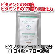 「ピクノジェノール」は、フランスの南西部ボルドー地方の海岸 に生育するフランス海岸松の樹皮よりとった天然の植物抽出 物です。プロシアニジンをはじめ40種類以上のフラボノイドが 含まれていて、ビタミンCの340倍の抗酸化作用があると言わ れています。