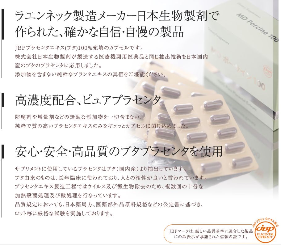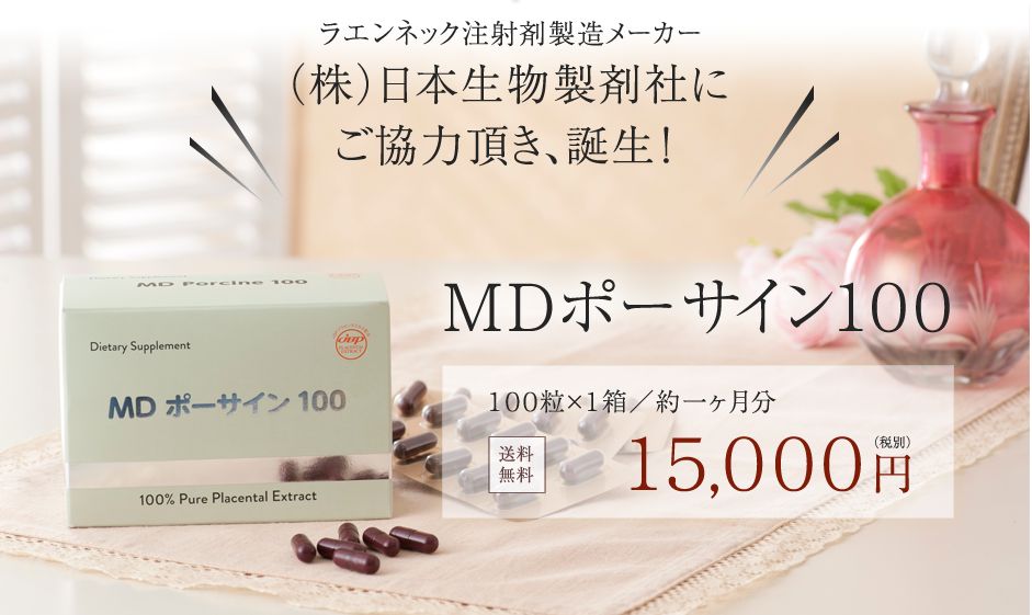 プラセンタ「MD ポーサイン 100」は、人との相性がいいブタ由来のプラセンタサプリメントで、防腐剤や増量剤などの無駄な添加物を一切ふくまない、質の高いプラセンタエキスを使用しています。