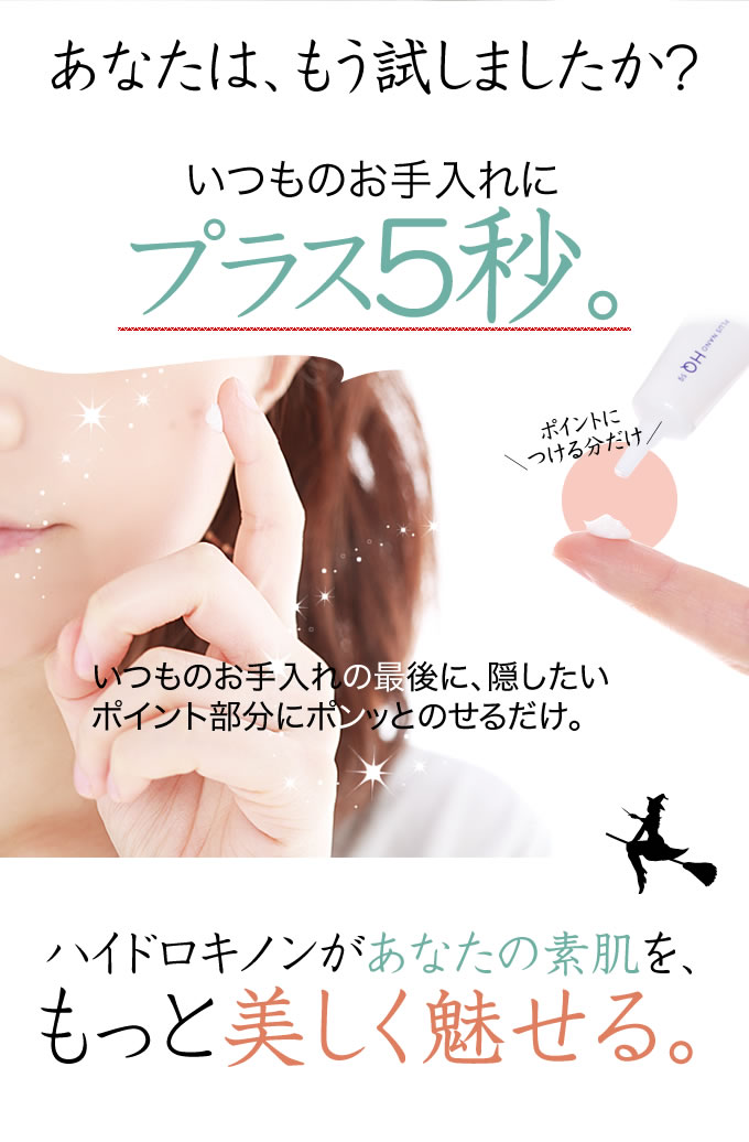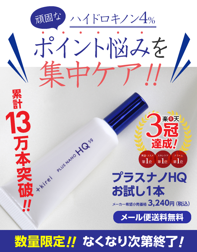 プラスキレイのプラスナノHQのクリームは、話題のハイドロキノンを4%配合したポイント集中ブライトングケア用のクリームです。ハイドロキノンをナノカプセル化した事により、肌の奥深くターゲットポイントまで高濃度でのアプローチを実現しました。いつものお手入れにプラスするだけで、白絹のような無地肌へと導きます。