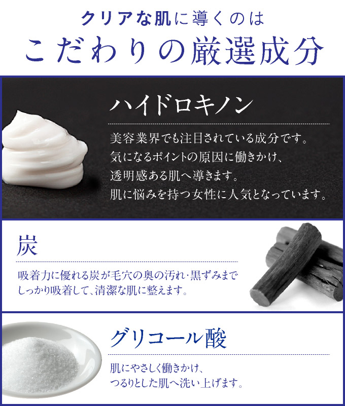 こだわりの成分【ハイドロキノン(1%以下)、炭、グリコール酸】で不要な汚れを落としクリアな肌に導く。