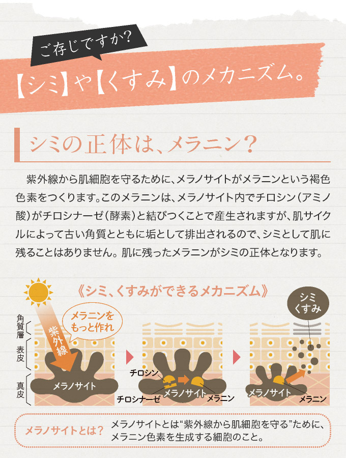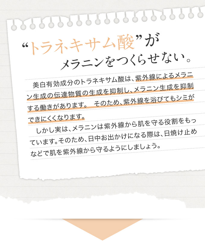 有効成分であるトラネキサム酸(美白効果)とグリチルリチン酸ジカリウム(メラニンの生成を抑える)配合。