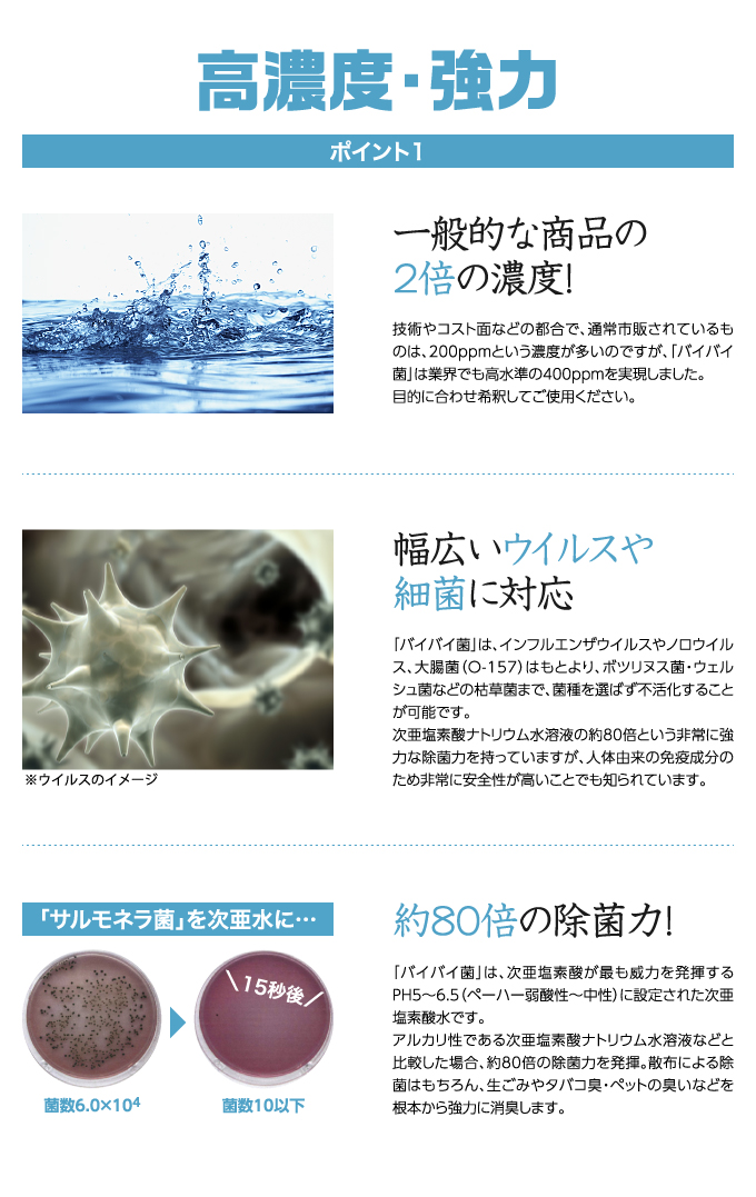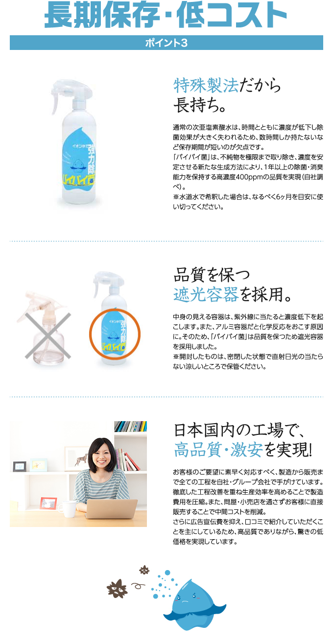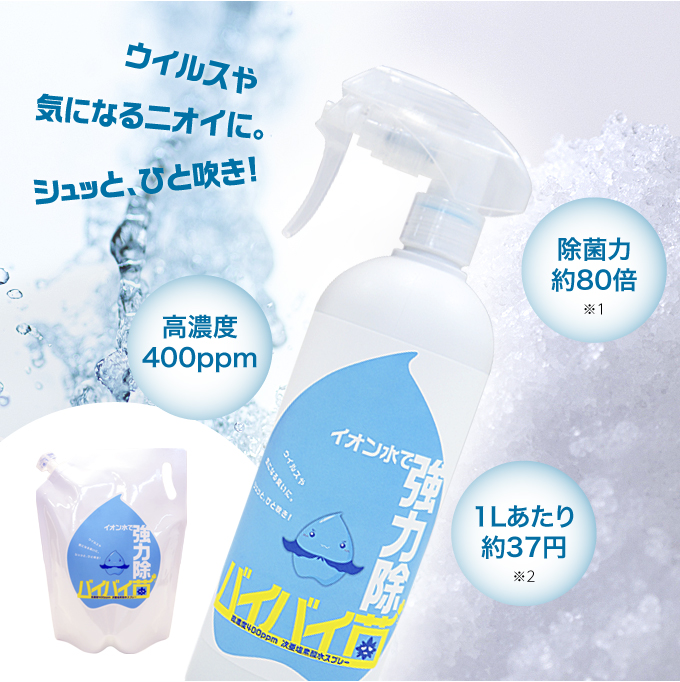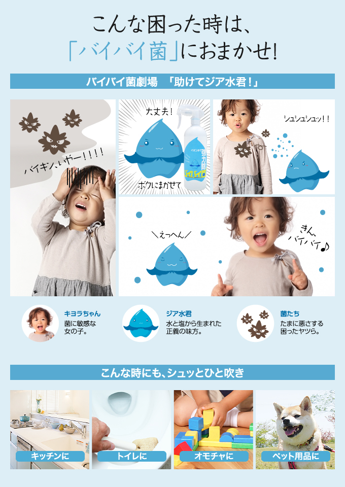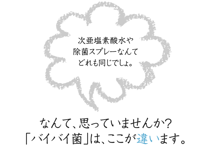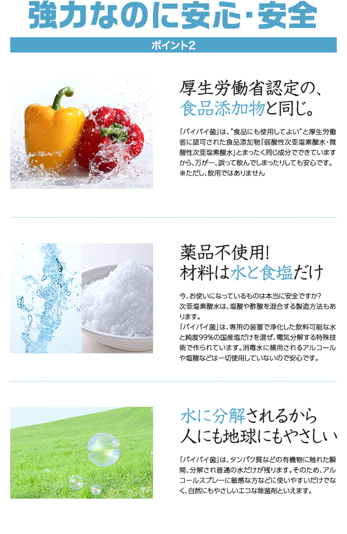 「バイバイ菌」は、水と塩から生まれた微酸性の除菌・消臭剤。厚生労働省に食品添加物として認定されている『微酸性次亜塩素酸水』と同じ成分なので、赤ちゃんから大人まで安心してお使いいただけます。また、菌や臭いのもとを分解した後は、普通の水に戻るから、地球にもやさしく安全です。(※次亜塩素酸水は、次亜塩素酸ナトリウムではありません。)