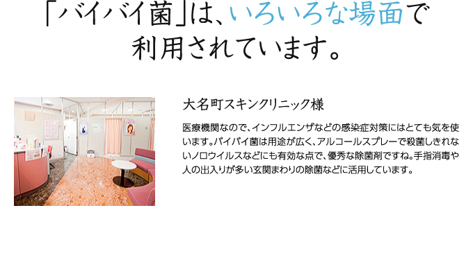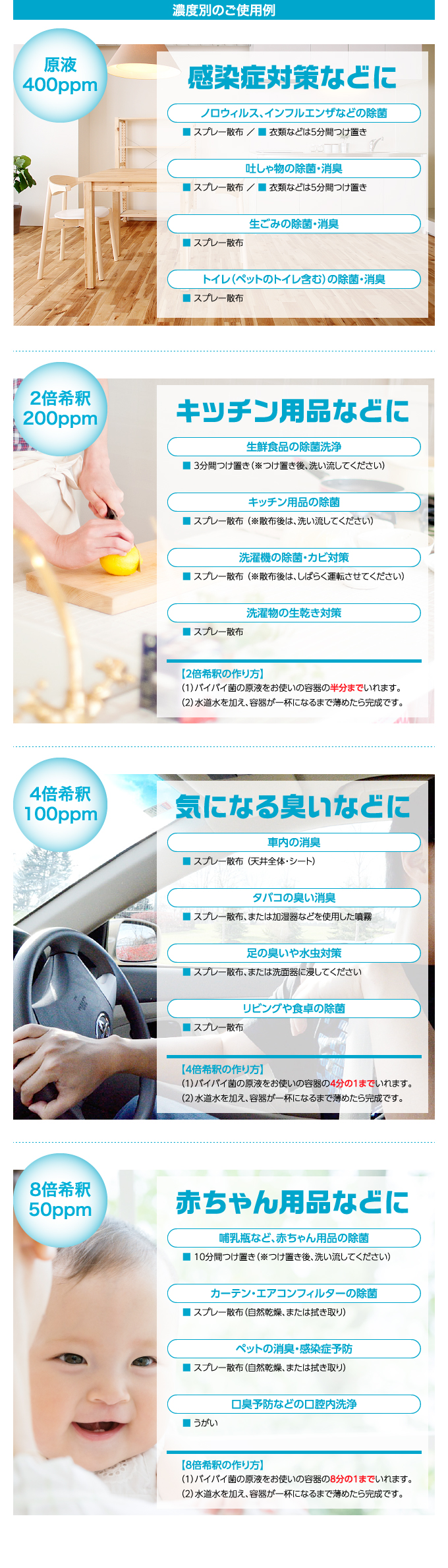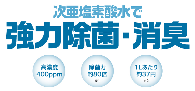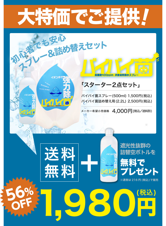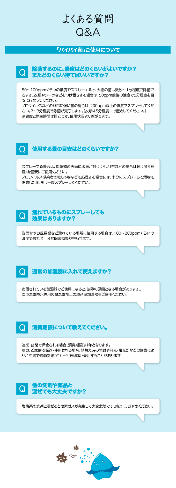 「バイバイ菌」は、水と塩から生まれた微酸性の除菌・消臭剤。厚生労働省に食品添加物として認定されている『微酸性次亜塩素酸水』と同じ成分なので、赤ちゃんから大人まで安心してお使いいただけます。また、菌や臭いのもとを分解した後は、普通の水に戻るから、地球にもやさしく安全です。(※次亜塩素酸水は、次亜塩素酸ナトリウムではありません。)