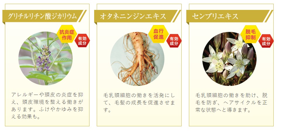 ※グリチルリチン酸ジカリウム、センブリ抽出液、ニンジンエキス(ファーサ育毛トニック)