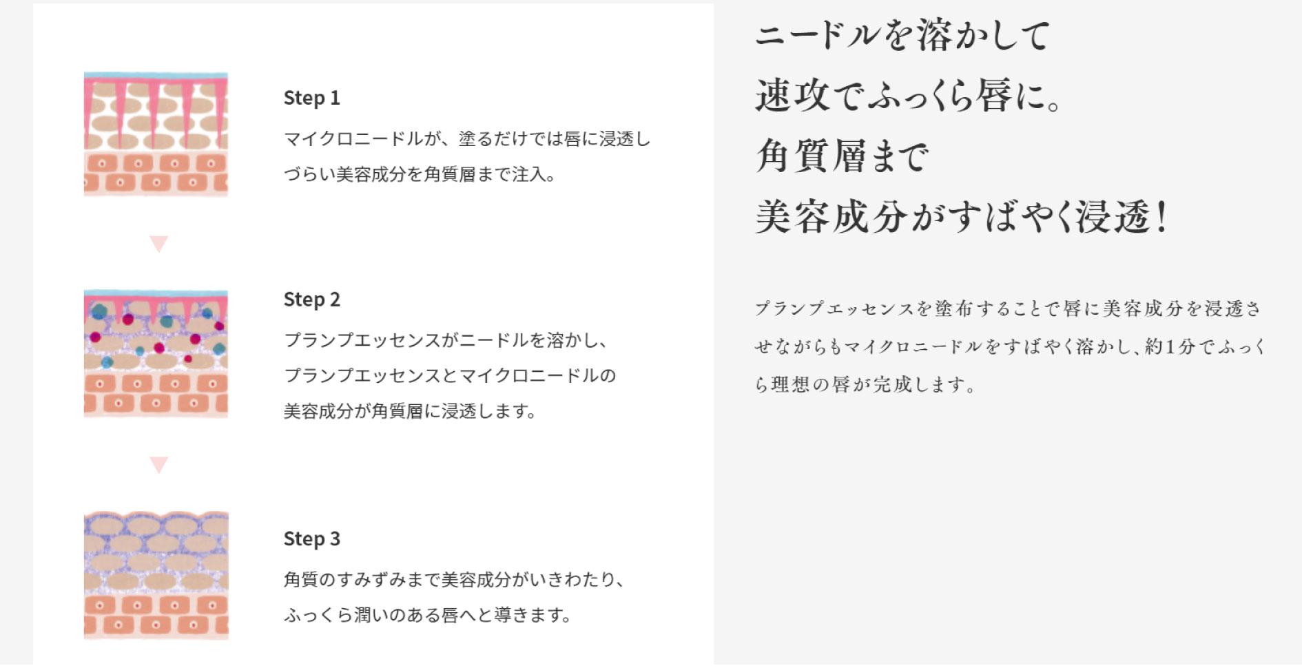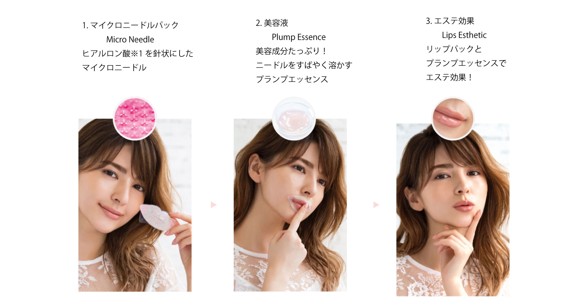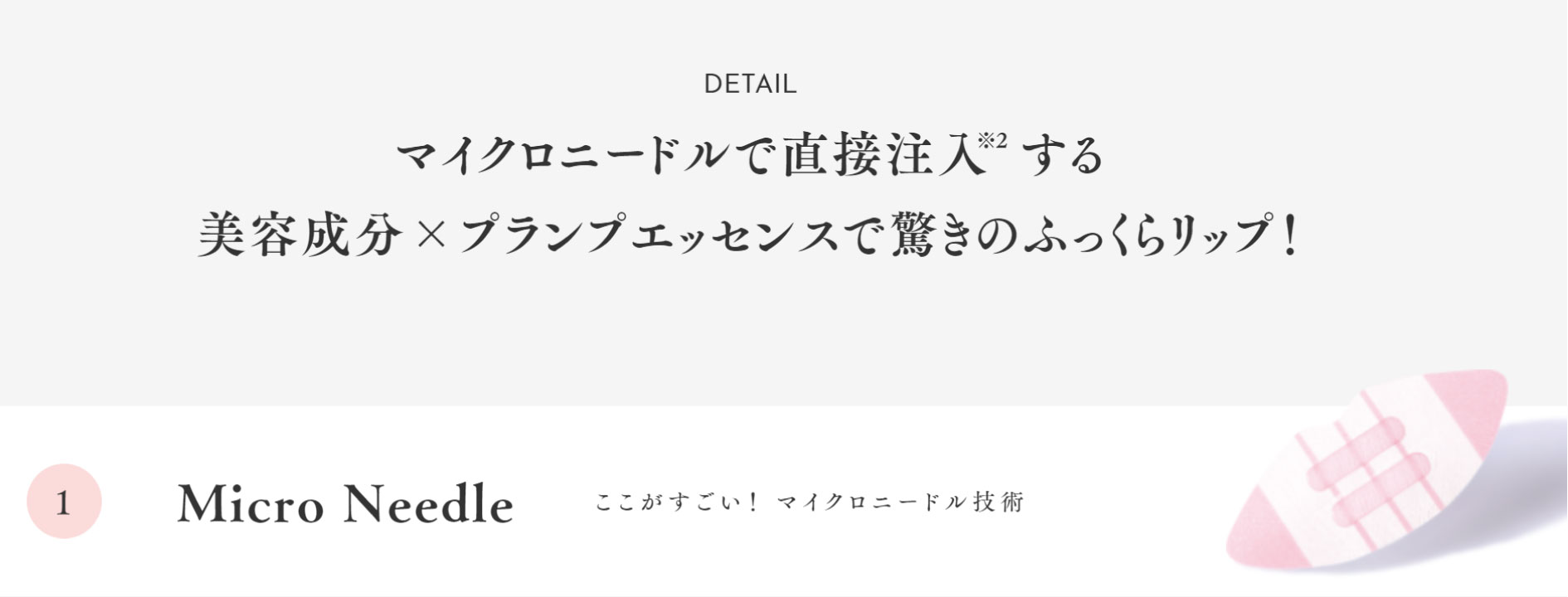 リップをふっくらさせる"プランプ成分"をマイクロニードル(針状)にした唇パックと、美容成分たっぷりの美容液を使って、簡単1分でぷるんとした唇になれるアイテムです。