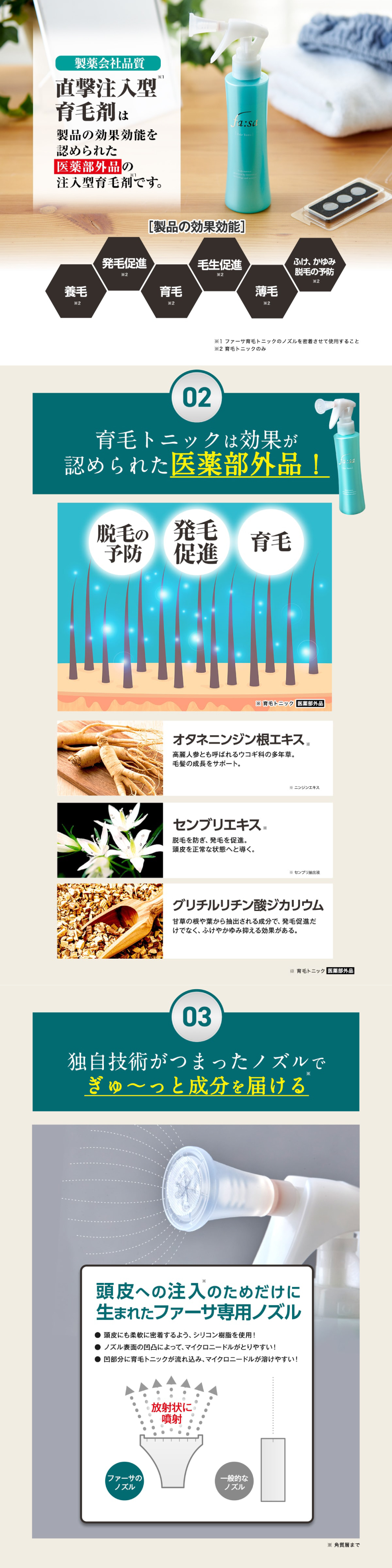 医薬部外品である「ファーサ 育毛トニック」には育毛効果が認められた3種の有効成分(グリチルリチン酸ジカリウム、オタネニンジン根エキス※1、センブリエキス※2)を配合。