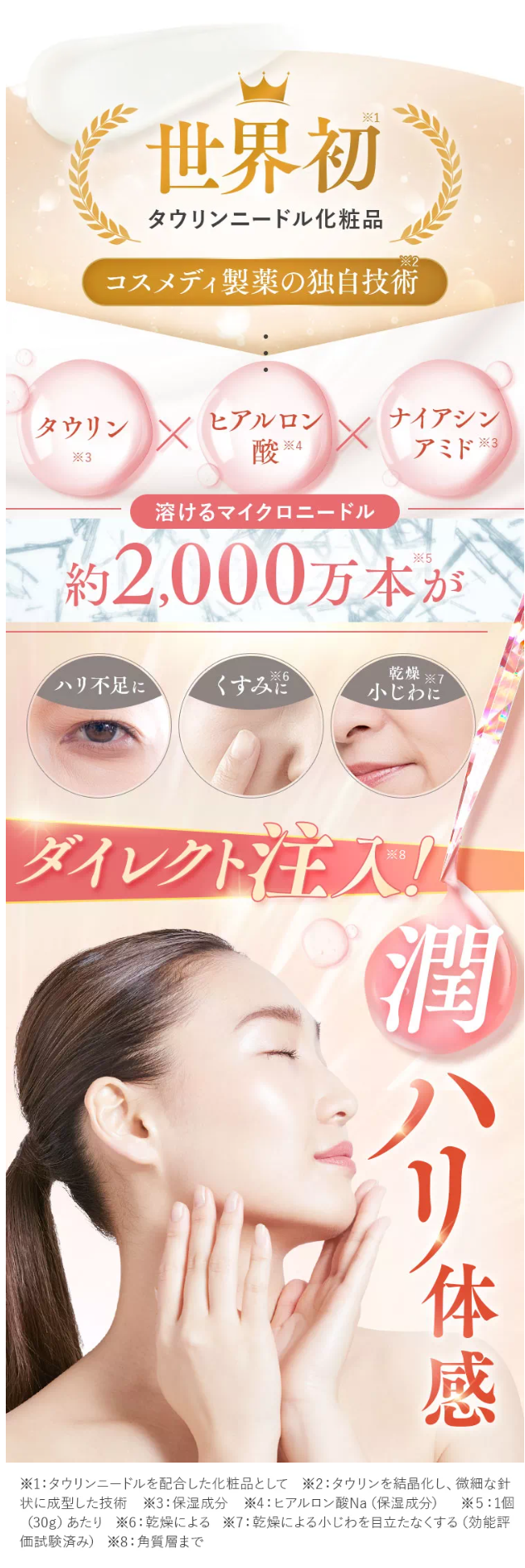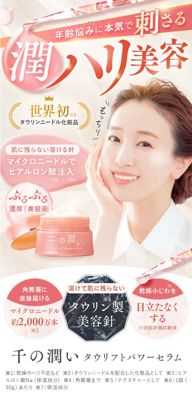 「ぬって、刺さって*³、溶ける」タウリン*¹でできた微細な針が、お肌に元気をチャージ!約2,000万本*⁴のタウリン*¹ニードルを美容液にぎゅーっと閉じ込めました!顔はもちろん首や手にも!優しく溶けてもっちりハリ肌へ導きます。