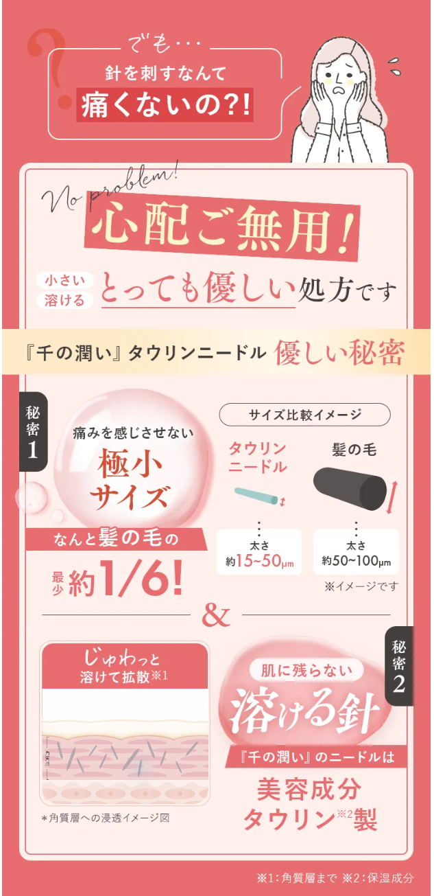 年齢と共に減少するタウリン*¹を直接注入*³できるだけではなく、タウリン*¹ニードルの中にはヒアルロン酸*²やナイアシンアミド*¹もたっぷり詰まっていて肌*³に刺さると全部一緒に溶けて浸透*³していきます。