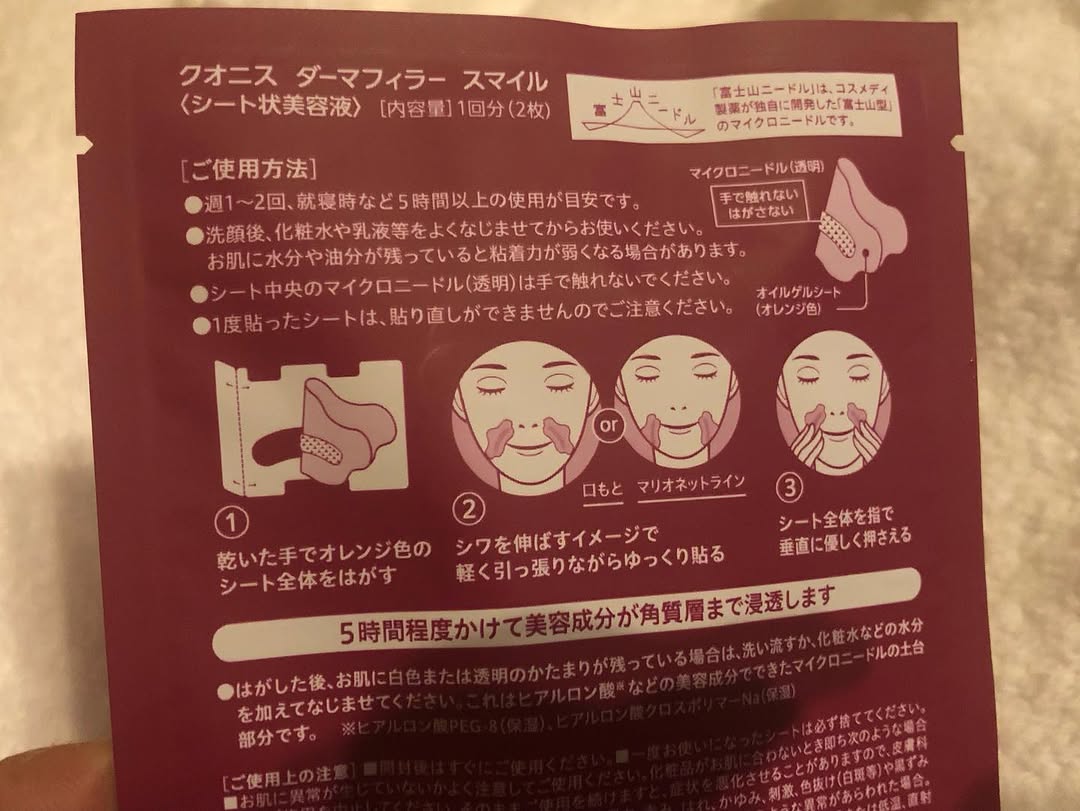 ・ ☆☆〜☆☆〜☆☆〜☆☆〜☆☆〜☆☆ コスメディ製薬株式会社 クオニス ダーマフィラースマイル 1回分 2枚 ☆☆〜☆☆〜☆☆〜☆☆〜☆☆〜☆☆ 只今,私の中で流行りのニードルケア。 前回は,薄い唇対策としてLIPS SHOT (リップショット) を使ってみました。 今回は、ほうれい線やマリオネットライン等に貼る "クオニス ダーマフィラー スマイル" (シート状美容液)を使ってみました。 袋の中身は,ほうれい線、マリオネットラインに貼る シートが1回分、2枚が入っていました。 薄いシートで中央にマイクロシートが 貼られているシートになります。 そのシートをほうれい線に合わせて貼って 軽く押さえると、マイクロニードルの部分が少しだけ チクチク感じます。 このニードルは『富士山ニードル』と言って コスメディ製薬さんが独自で開発された 「富士山型」のマイクロニードルだそうです。 このニードルのチクチクした感覚は ヒアルロン酸が注入されてるなーって!! 思える瞬間でもあります。 その後は気がつくとチクチク感は なくなっている感じですよ。 シートは、夜に貼って、翌朝までそのままです。 5時間以上かけて美容成分を角質層まで浸透させる 感じで、しっかり時間をかけて使います。 翌朝、このシートを剥がす時は ワクワクするんですよね。 肌も瑞々しさを感じられて、 少しふっくらしてるような、、、 だから、 スペシャルケアで時々使いたくなります。 1週間で1〜2回位の使用がお勧めとの事。 マイクロニードルでヒアルロン酸注入を この後も定期的に続けられたら良いと 思いました。 ・ #PR #コスメディ製薬株式会社 #quanis #クオニス #ダーマフィラースマイル #コスメディ製薬 #マイクロニードル #富士山ニードル #ほうれい線まわり #乾燥肌 #ハリ不足 #マイクロニードルコスメ #マイクロニードル化粧品 #針コスメ #シワ #年齢ケア #エイジングケア #monipla #quanis_fan