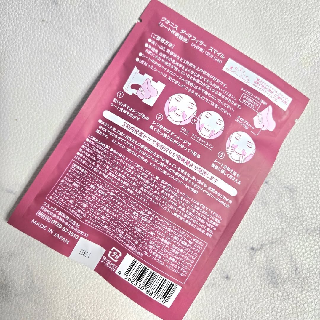 ⋆ お家でヒアルロン酸注入*¹! *¹ 角質層まで / クオニス ダーマフィラースマイル \ おためしさせていただきました☺ ヒアルロン酸などの美容成分をミクロの針状に結晶化したマイクロニードルが付いたシート状の美容パッチだよ 口もとに貼り付けると、美容成分の針が肌内の水分とまじわって溶け出し、塗るだけでは届かなかった美容成分を、角質層までしっかり浸透させるので、口もとの集中ケアが叶うアイテムなんだって 貼って寝るだけ!笑 ほうれい線ねらって貼るのがちょっとむずい しっとりしててよかったよ ありがとうございました♡ #PR #コスメディ製薬株式会社 #quanis #クオニス #ダーマフィラースマイル #コスメディ製薬 #マイクロニードル #ニードルコスメ #ほうれい線まわり #乾燥肌 #ハリ不足 #マイクロニードルコスメ #マイクロニードル化粧品 #針コスメ #シワ #年齢ケア #エイジングケア #monipla #quanis_fan