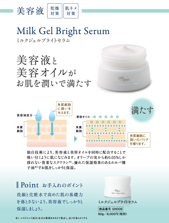 植物オイルの力でしっかり保湿するこっくりタイプのクリーム状美容液。独自の技術で美容液と美容オイルを同時に配合。吸い付くように肌になじみます。オリーブの実から0.05%しか取れない貴重なスクワラン、優れた保湿効果のあるホホバ種子油のダブルのエモリエント成分が潤いのヴェールを作り、お肌をしっかりと保湿します。 http://quanis.jp/milk-gel-bright-serum/