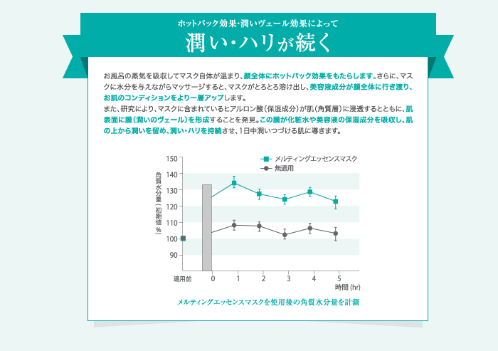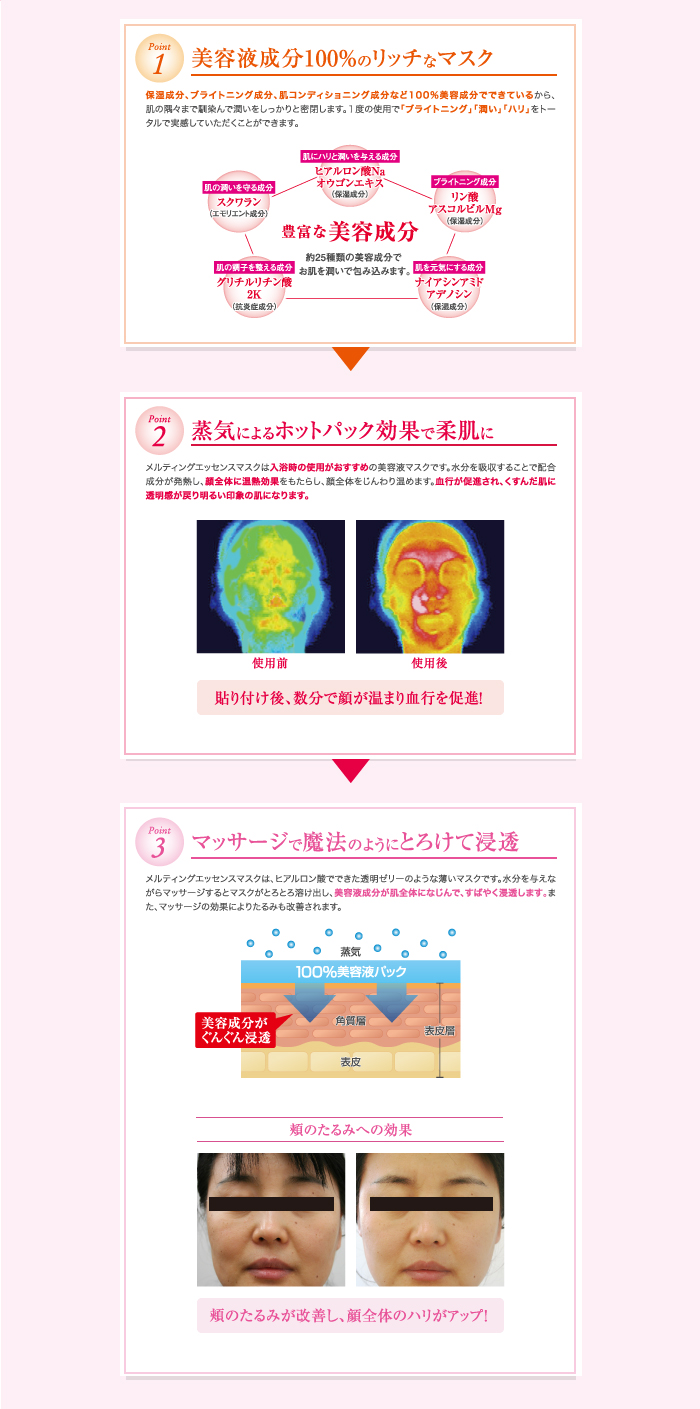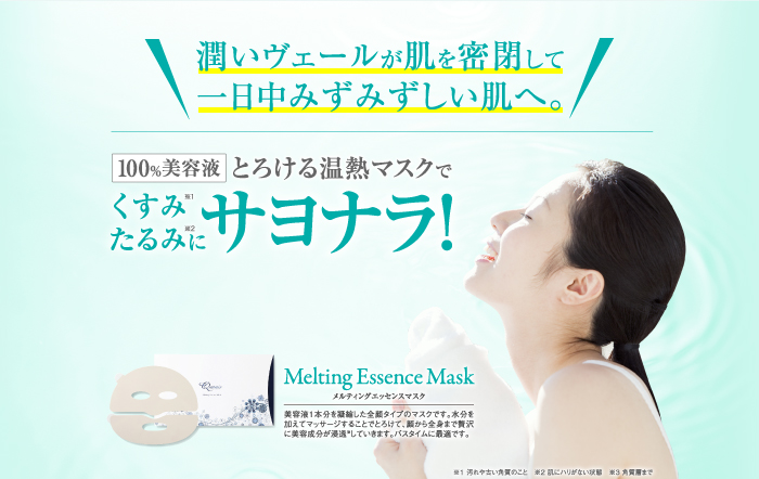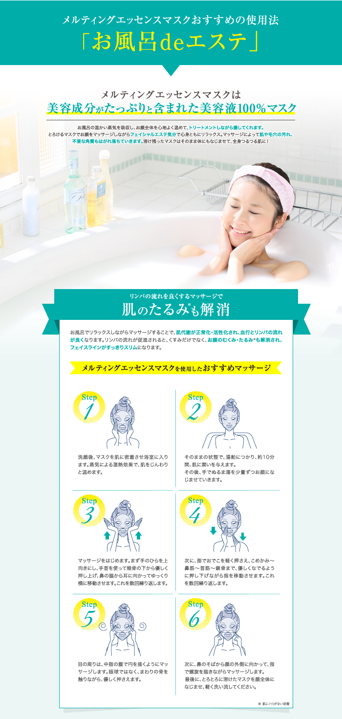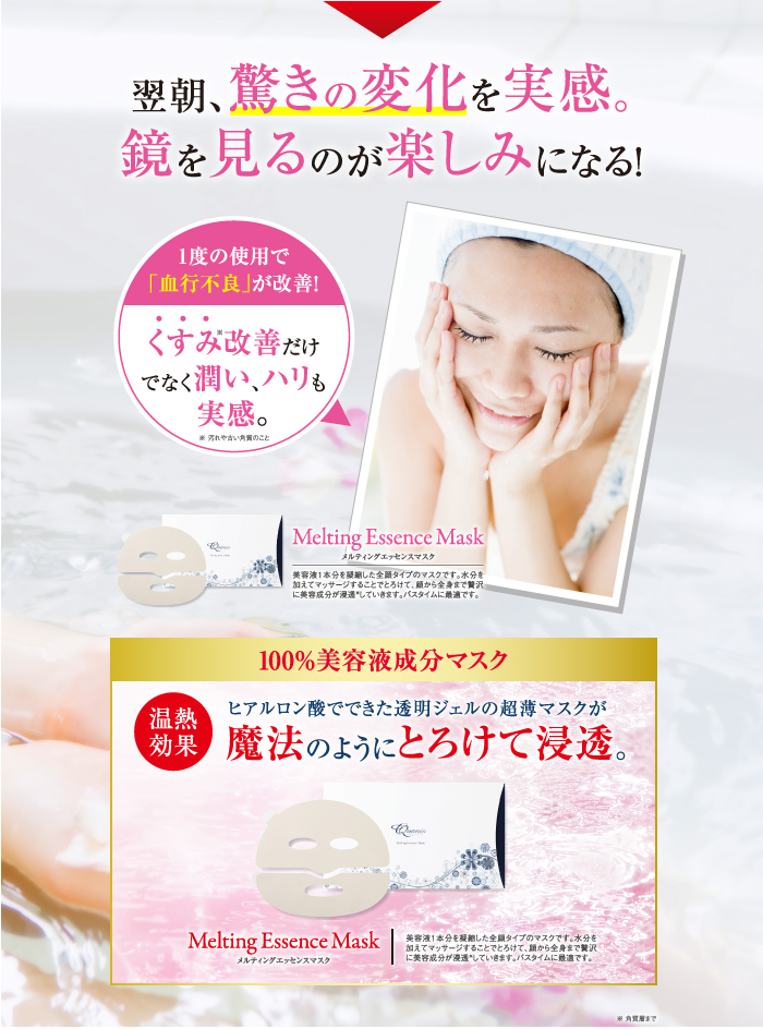 美容液成分100%でできたとろける新発想のマスクです。入浴時にご使用いただくと、蒸気により発熱したマスクがお顔全体をじんわりと温め、毛穴を広げてお肌に潤いを与えます。さらに、マスクの上からマッサージすることで、美容液成分がとろとろ溶けだし、ヒアルロン酸などの成分による魔法のような潤いのヴェールがお顔全体を包み込みます。翌朝が楽しみになるご褒美ケア。