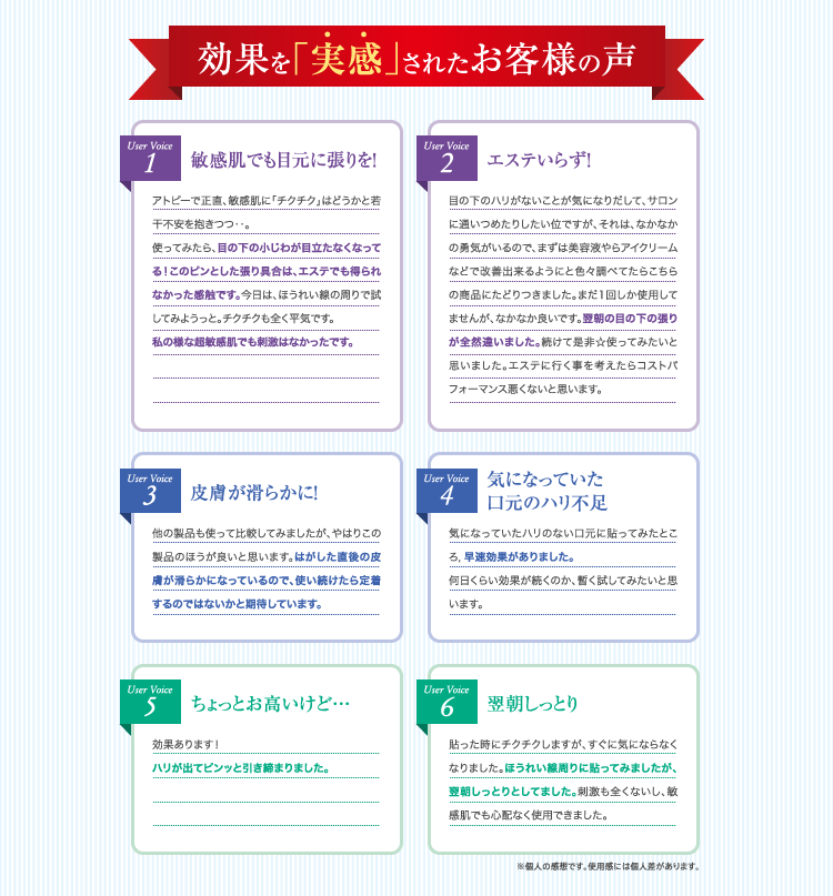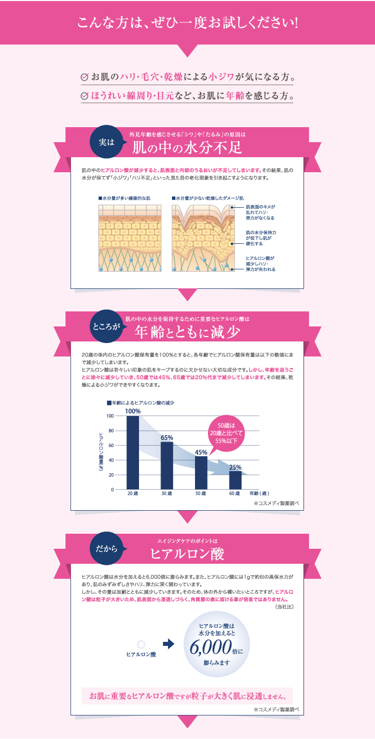 新技術でヒアルロン酸を数百ミクロン単位の針状に並べた目元・目尻・口元用の部分シートマスク。年齢が気になるお肌の角質層の奥深くに必要な潤い成分をマイクロニードルにより直接届けます。ナイトケアシートとして寝る前に貼ってお休みください。一晩かけてヒアルロン酸がゆっくりと溶解し、角質層の奥までじっくり浸透します。内側から肌を押し出すように、お肌に潤いとハリを与え乾燥による小じわを目立たなくします。貼って寝るだけで手軽にヒアルロン酸注射のような注入をご実感いただける革新的エイジングケア!