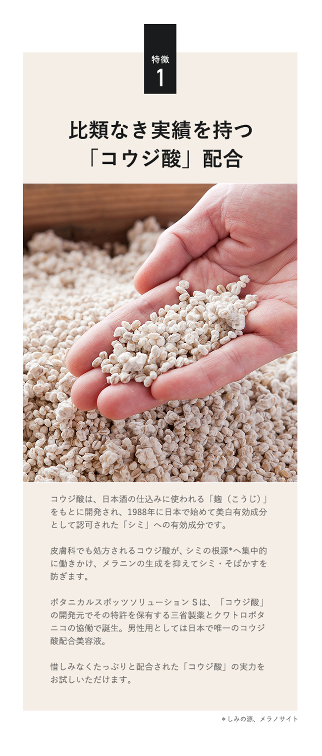 麹菌の発酵過程で生みだされる発酵代謝液から抽出・精製される有効成分「コウジ酸」が、メラニンの生成を抑え、シミ・そばかすを防ぎます。
